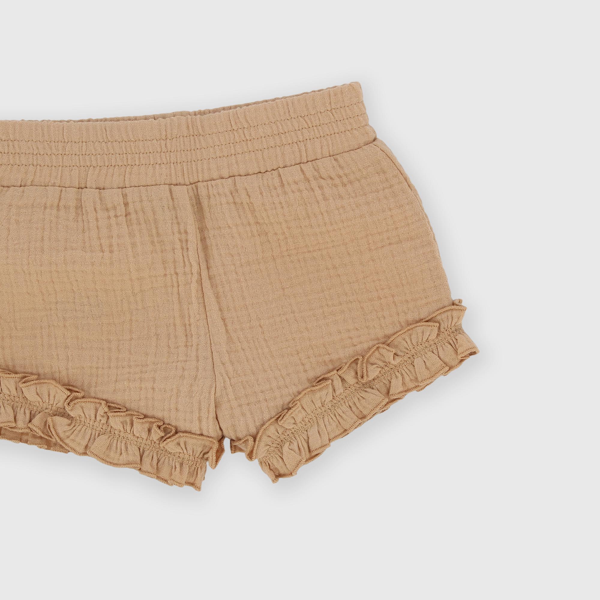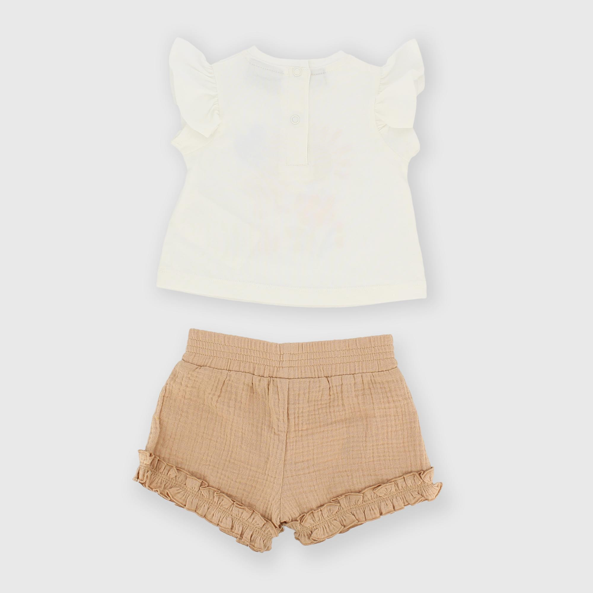 Ensemble composé de deux pièces. T-shirt en jersey à col rond, manches courtes avec volants. Fermeture au dos avec petits boutons. Imprimé sur le devant. Short en gaze avec taille élastiquée.