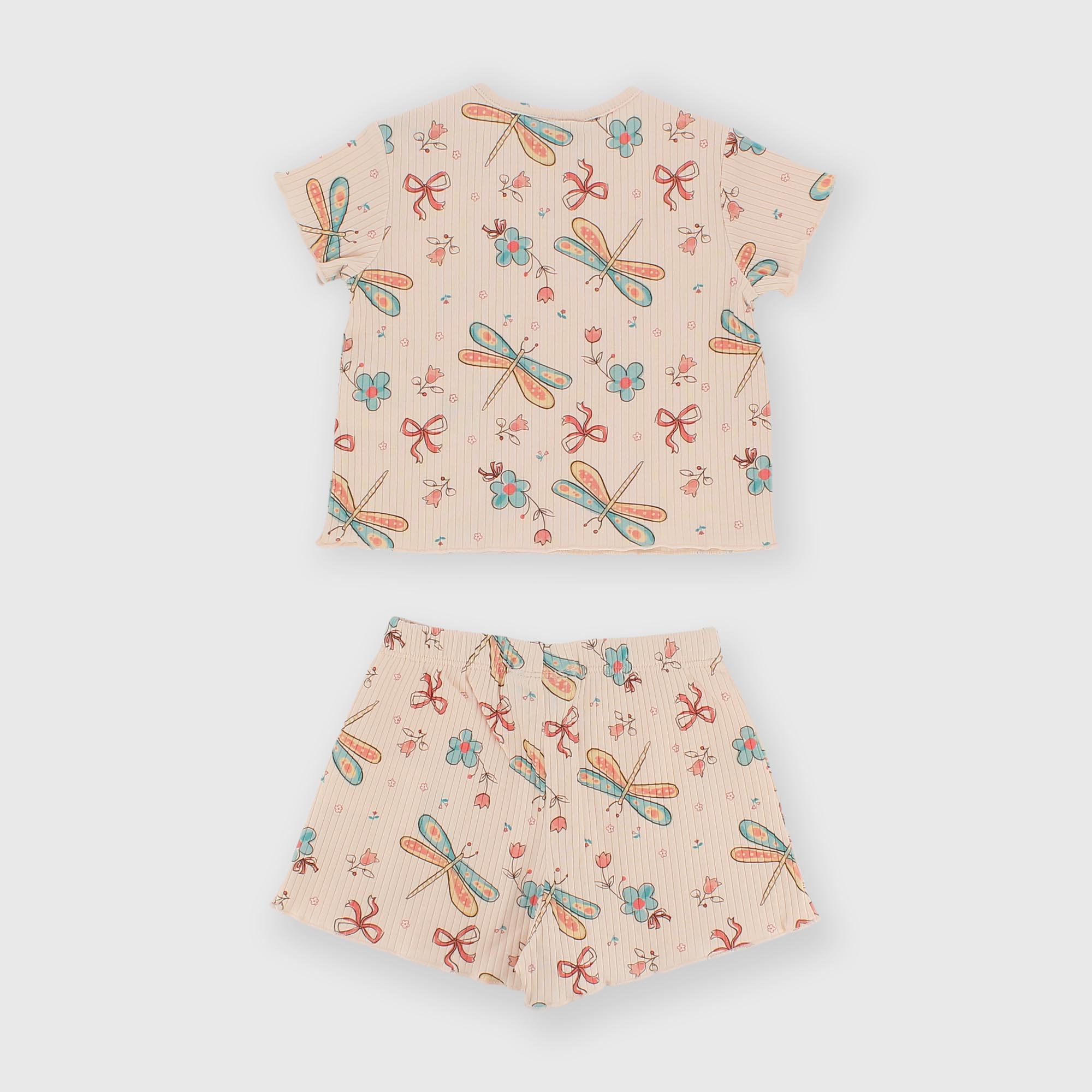 Ensemble côtelés composé de deux pièces. Imprimé intégral. T-shirt à col rond, manches courtes. Fermeture par boutons-pression sur l'épaule. Short à taille élastique. Finitions avec point poupée.