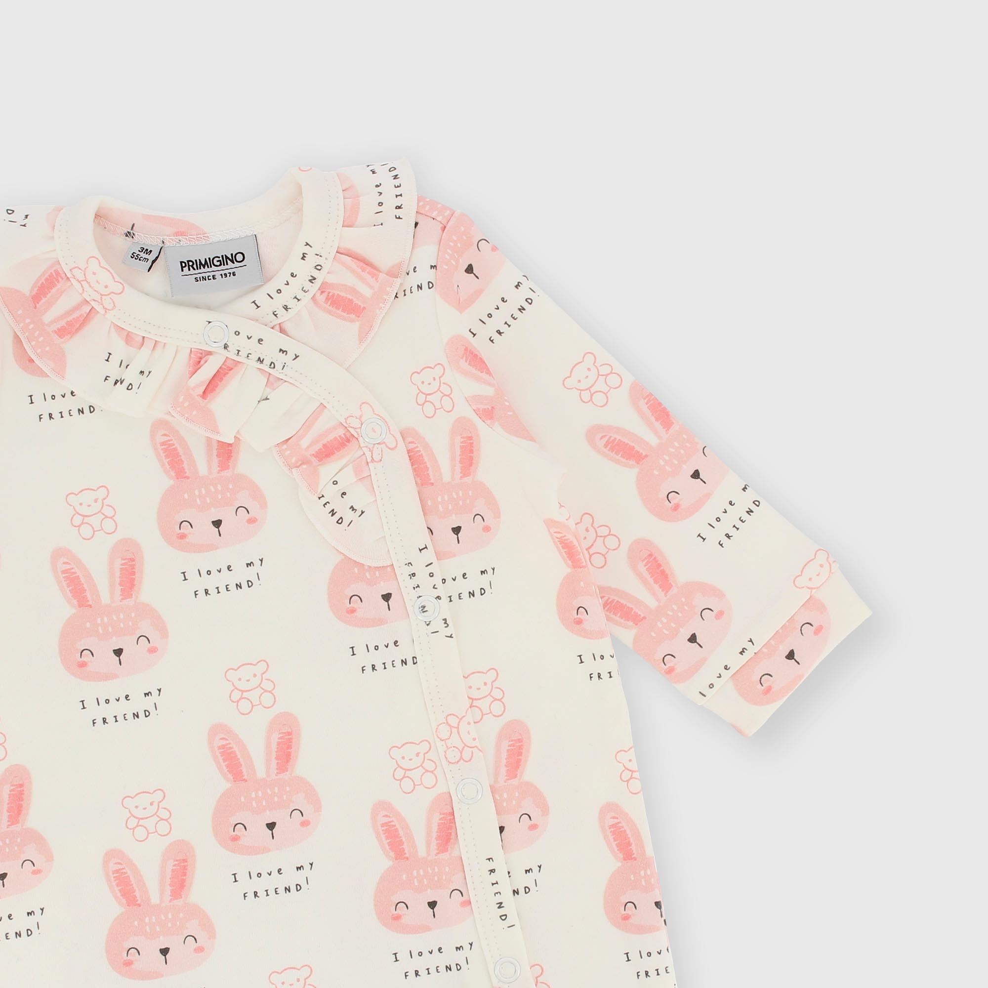 Combinaison en jersey à col rond, manches longues. Volants sur le col. Fermeture à kimono avec boutons-pression. Imprimé intégral de petits lapins.