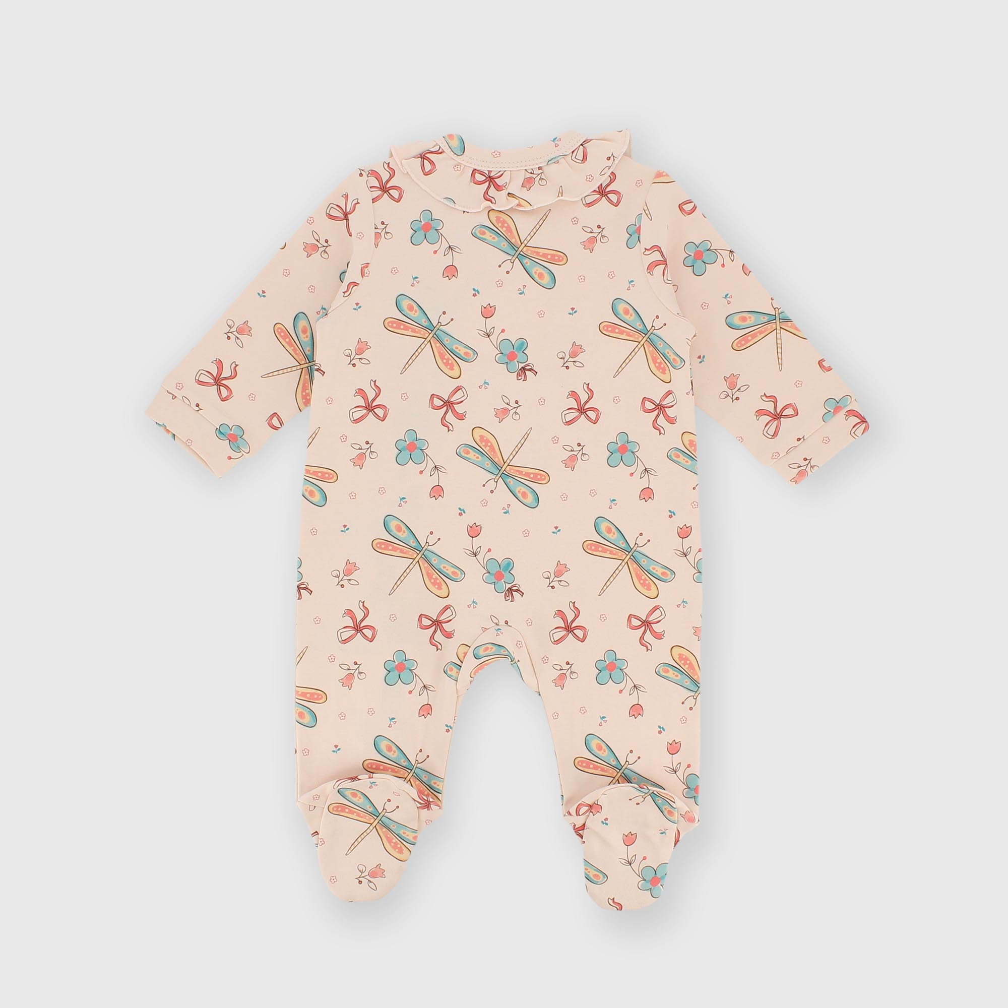 Combinaison en jersey à col rond avec manches longues. Volants sur le col. Fermeture kimono avec boutons-pression. Imprimé libellules sur toute la surface.