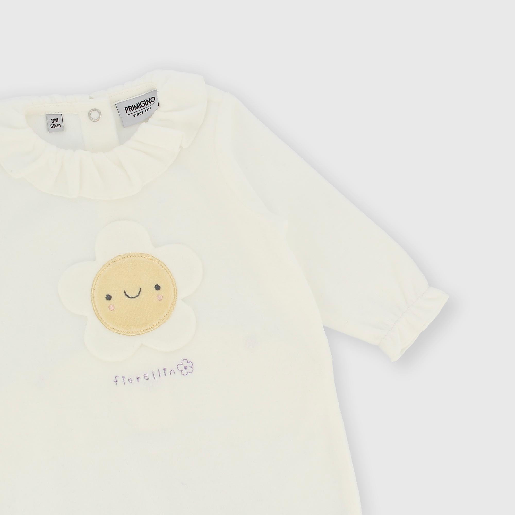 Combinaison en velours côtelé, col avec fleurs, à manches longues. Fermeture avec boutons au dos. Fleur appliquée devant.