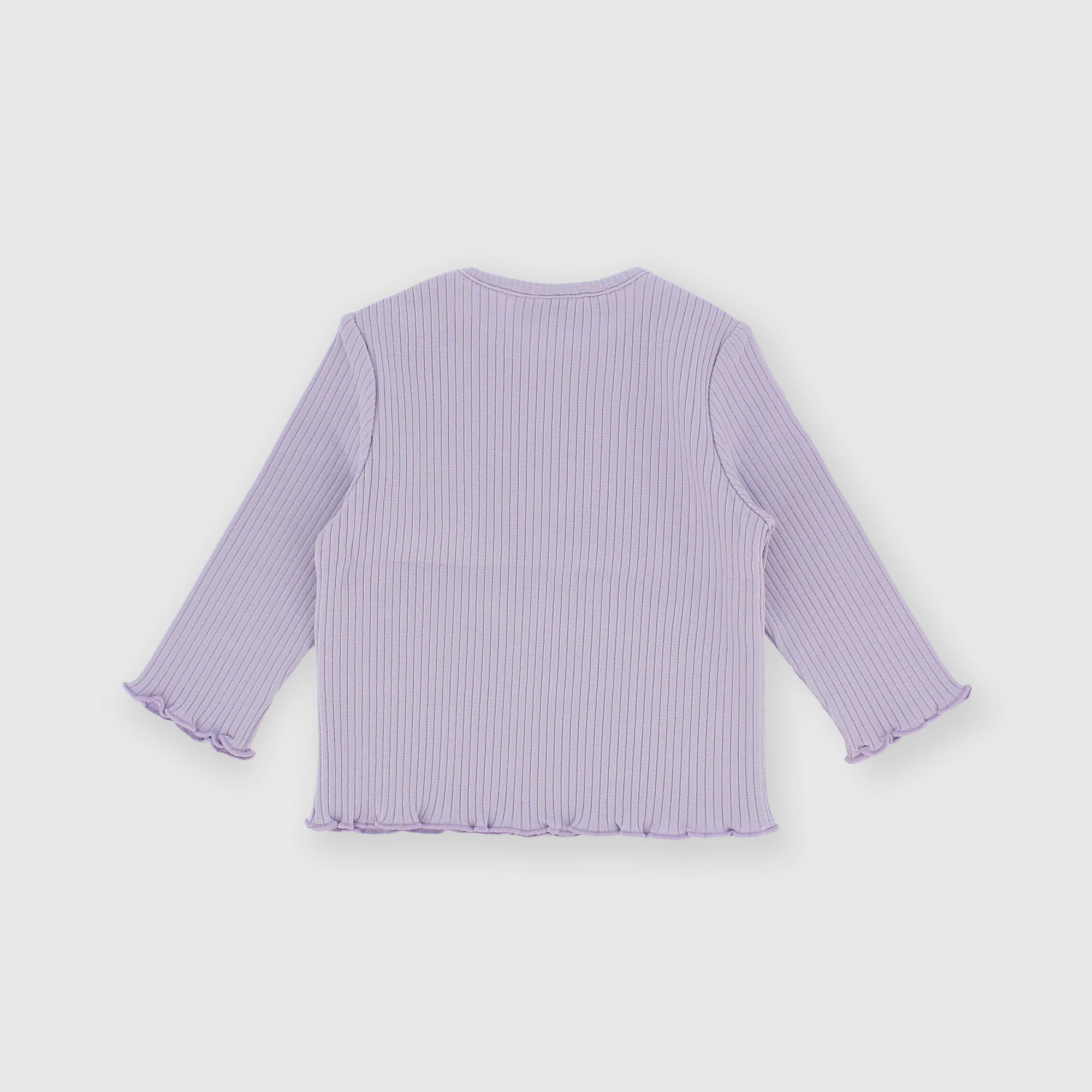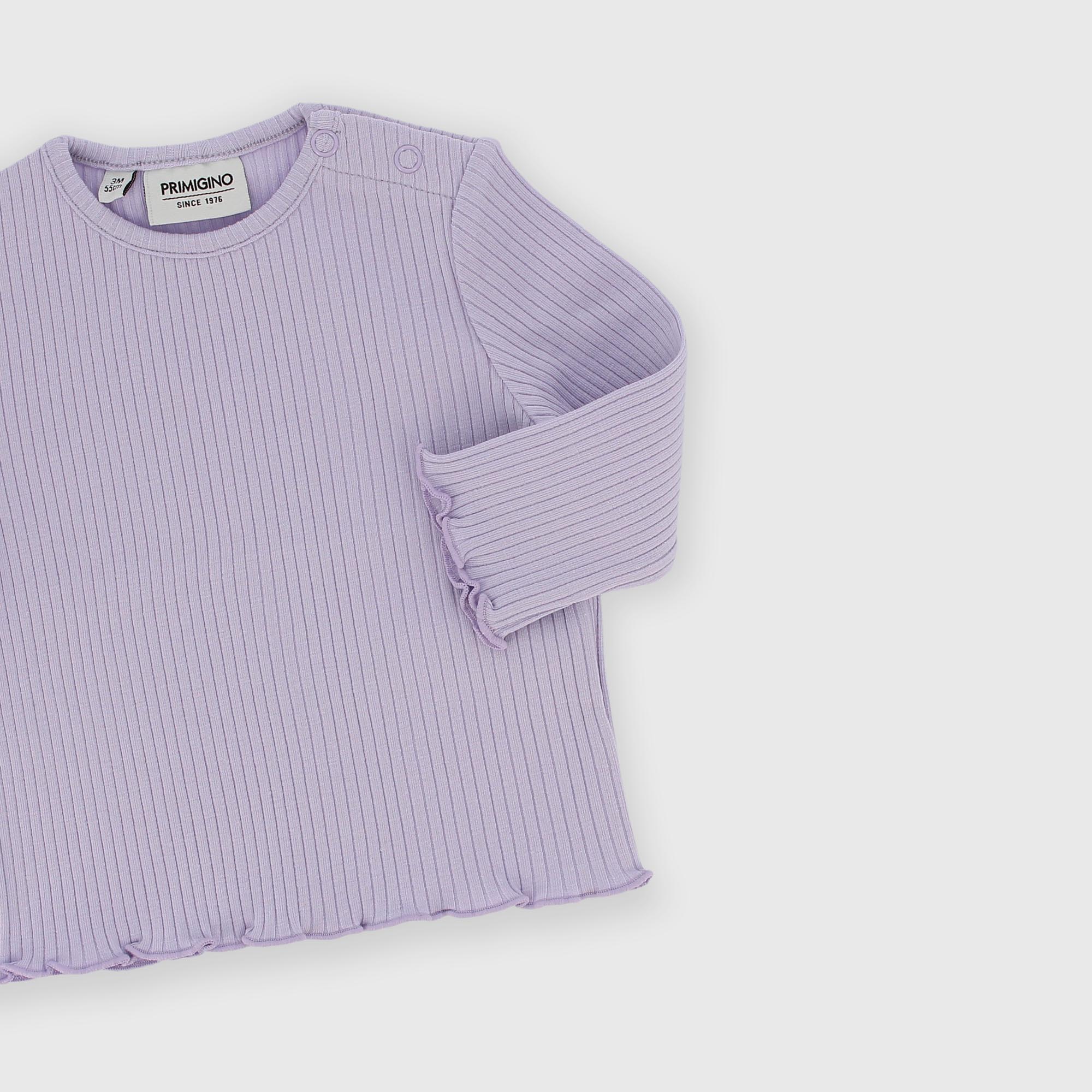 T-shirt côtelé, col rond, avec manches longues. Fermeture avec des boutons pression sur l'épaule. Finitions avec point de couture poupée.