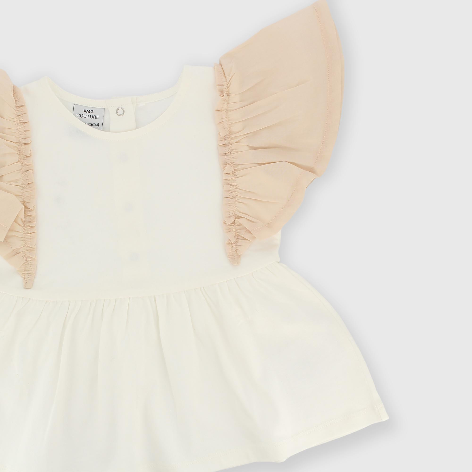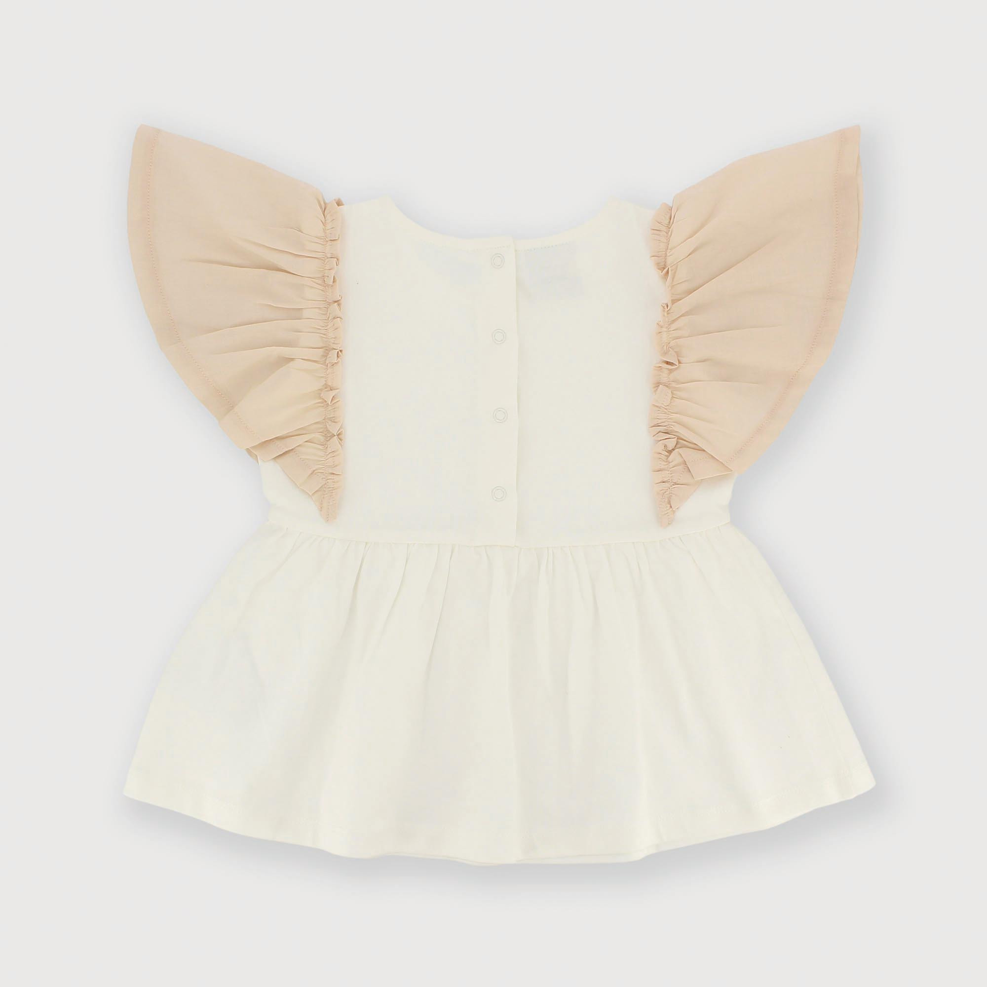T-shirt en jersey, col rond. Volants en coton-lin appliqués sur les épaules. Fermeture à pressions au dos.