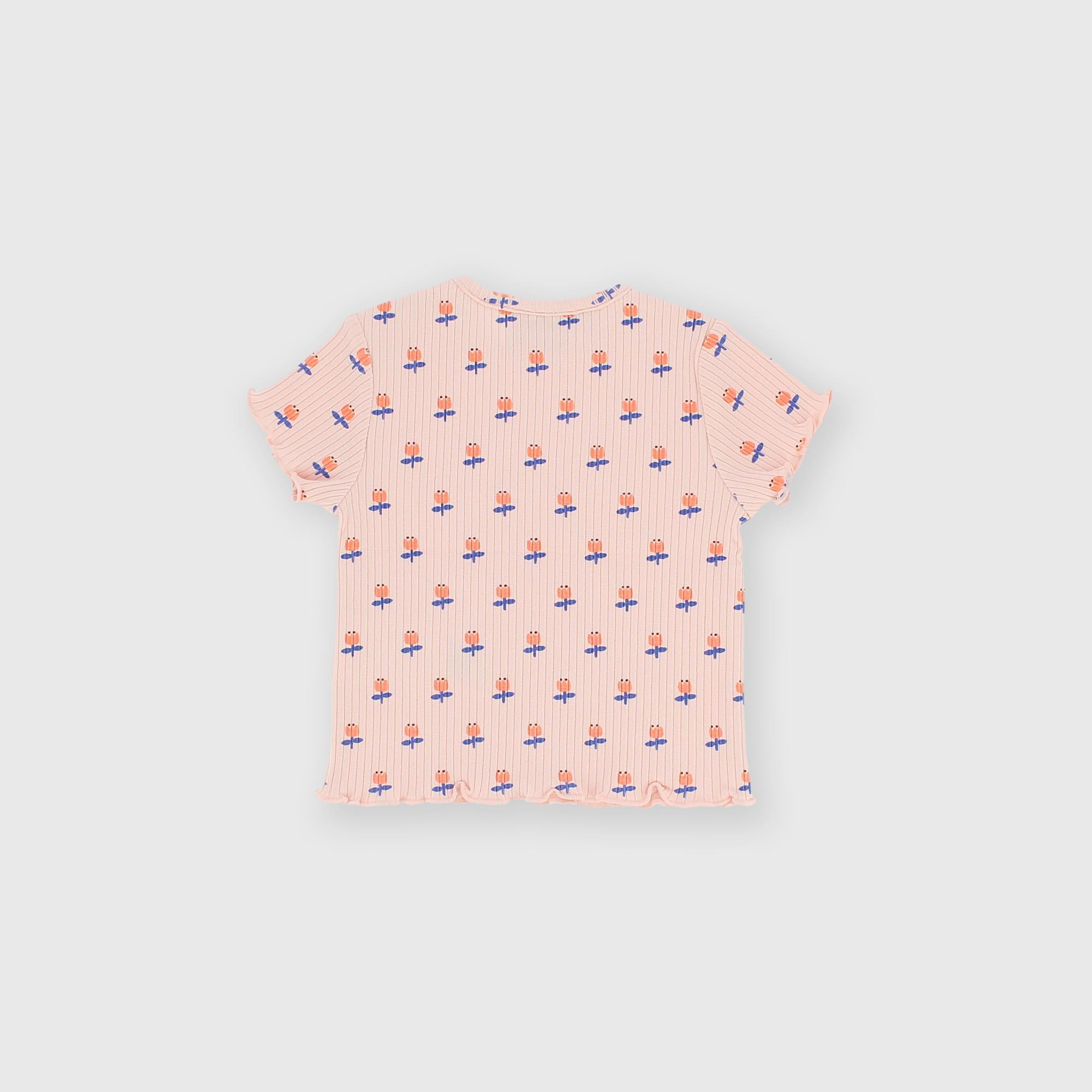 T-shirt côtelé, col-rond, manches courtes. Fermeture avec boutons pression sur l'épaule. Fleurs imprimées all-over.
