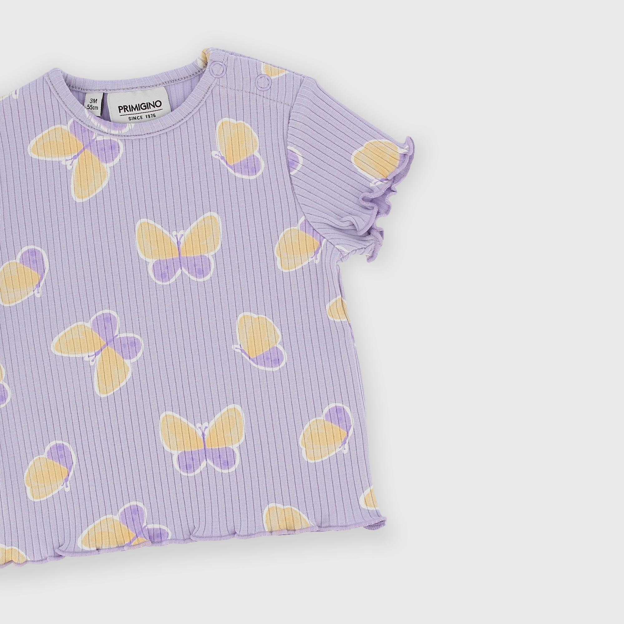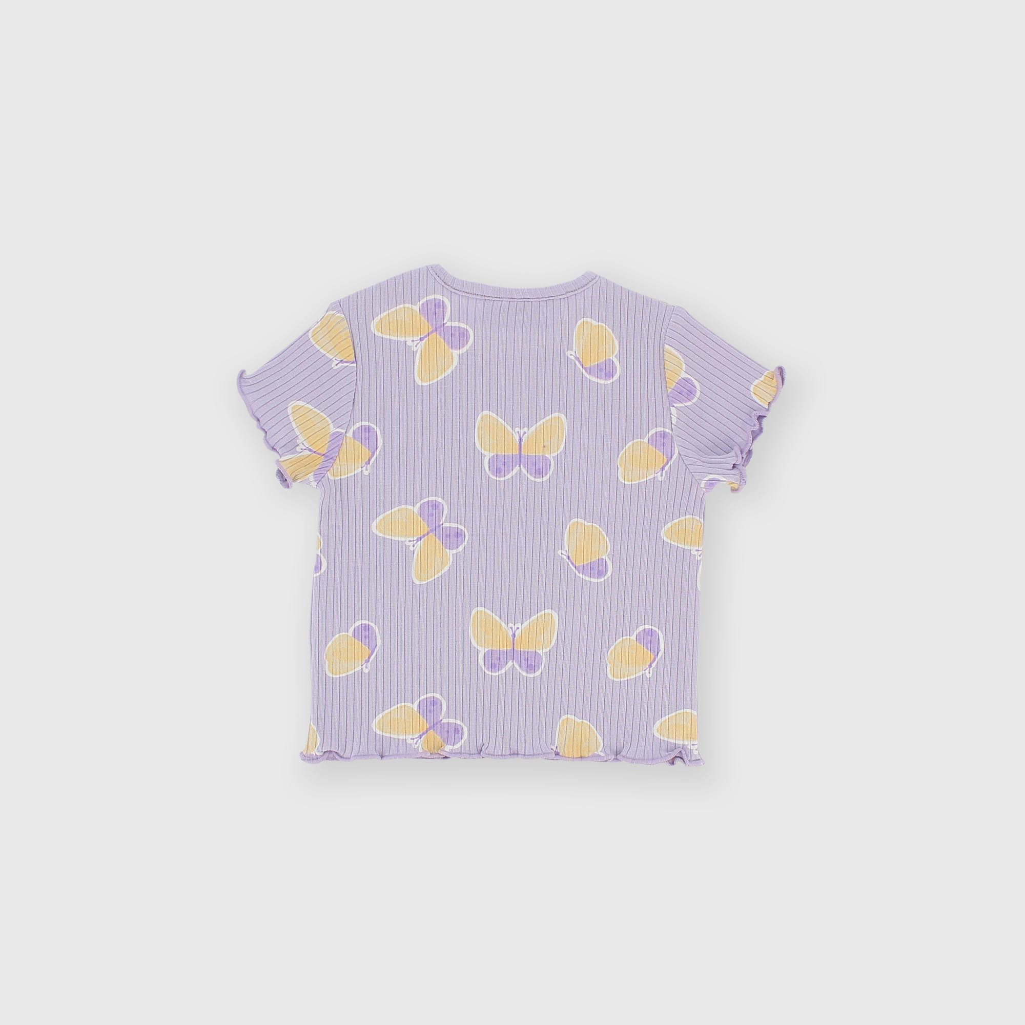 T-shirt côtelé, col rond, avec manches courtes. Fermeture avec boutons-pression sur l'épaule. Imprimé papillons sur toute la surface. Finitions avec point poupée.