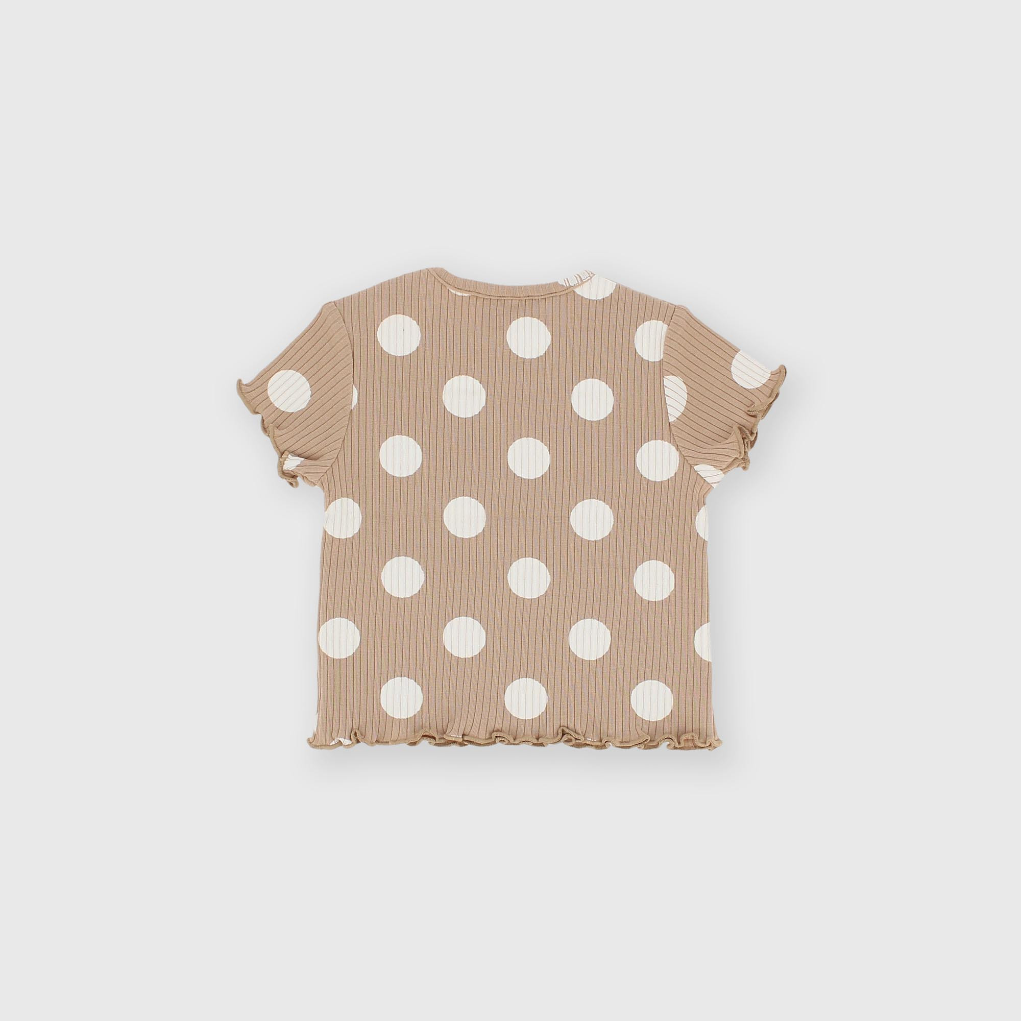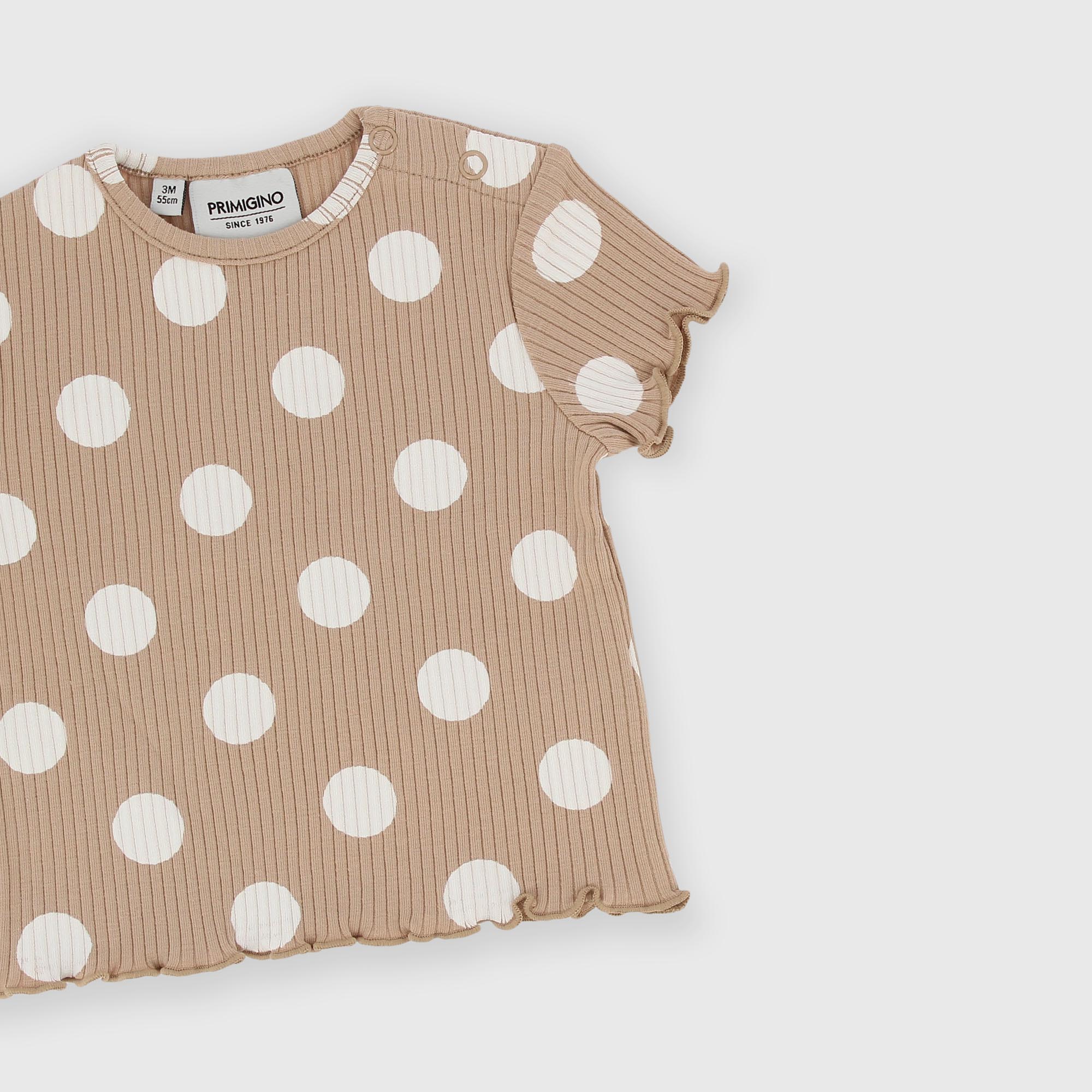 T-shirt côtelé, col rond, avec manches courtes. Fermeture avec boutons-pression sur l’épaule. Imprimé à pois sur toute la surface. Finitions avec point de poupée.