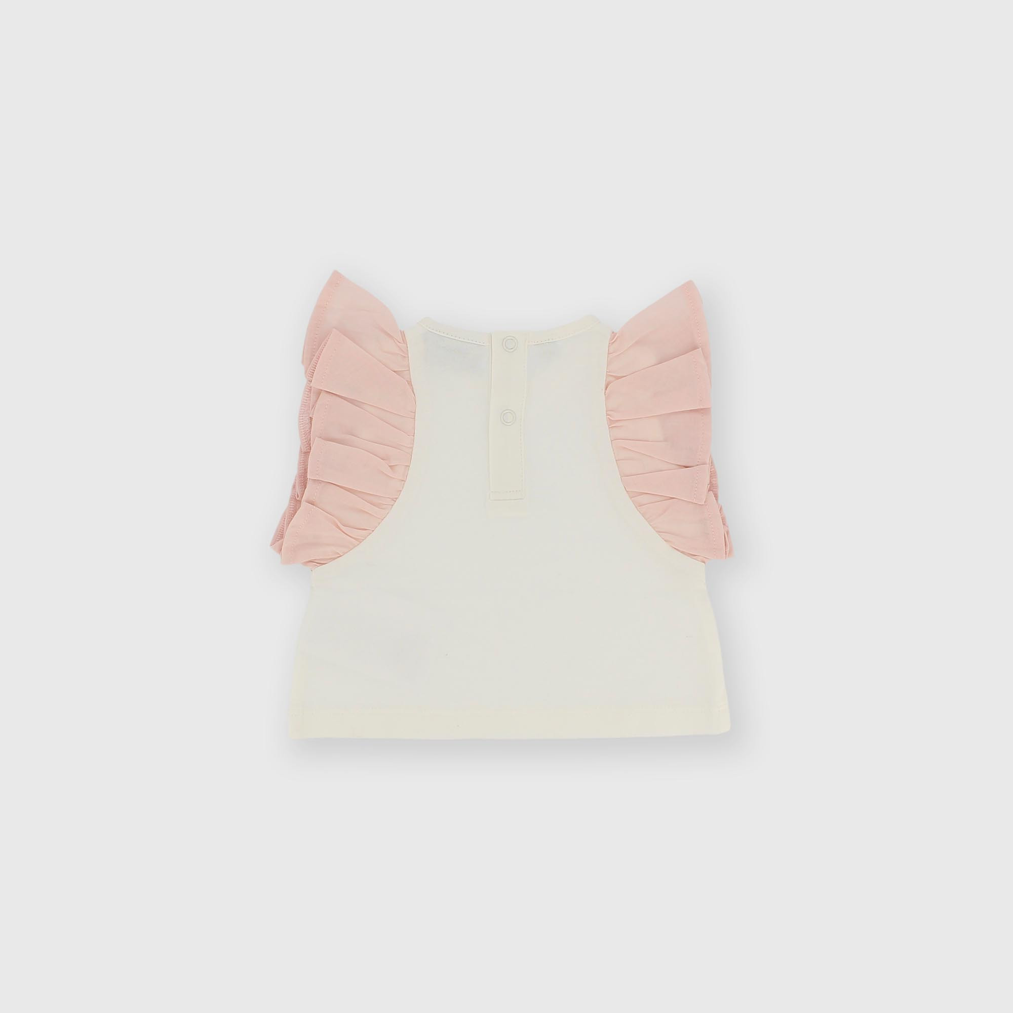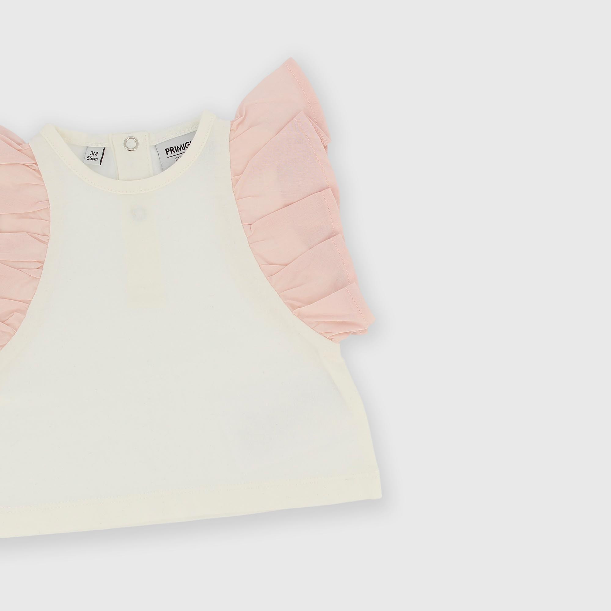 T-shirt en jersey, col rond. Volants en coton-lin appliqués sur les épaules. Fermeture avec boutons-pression au dos.
