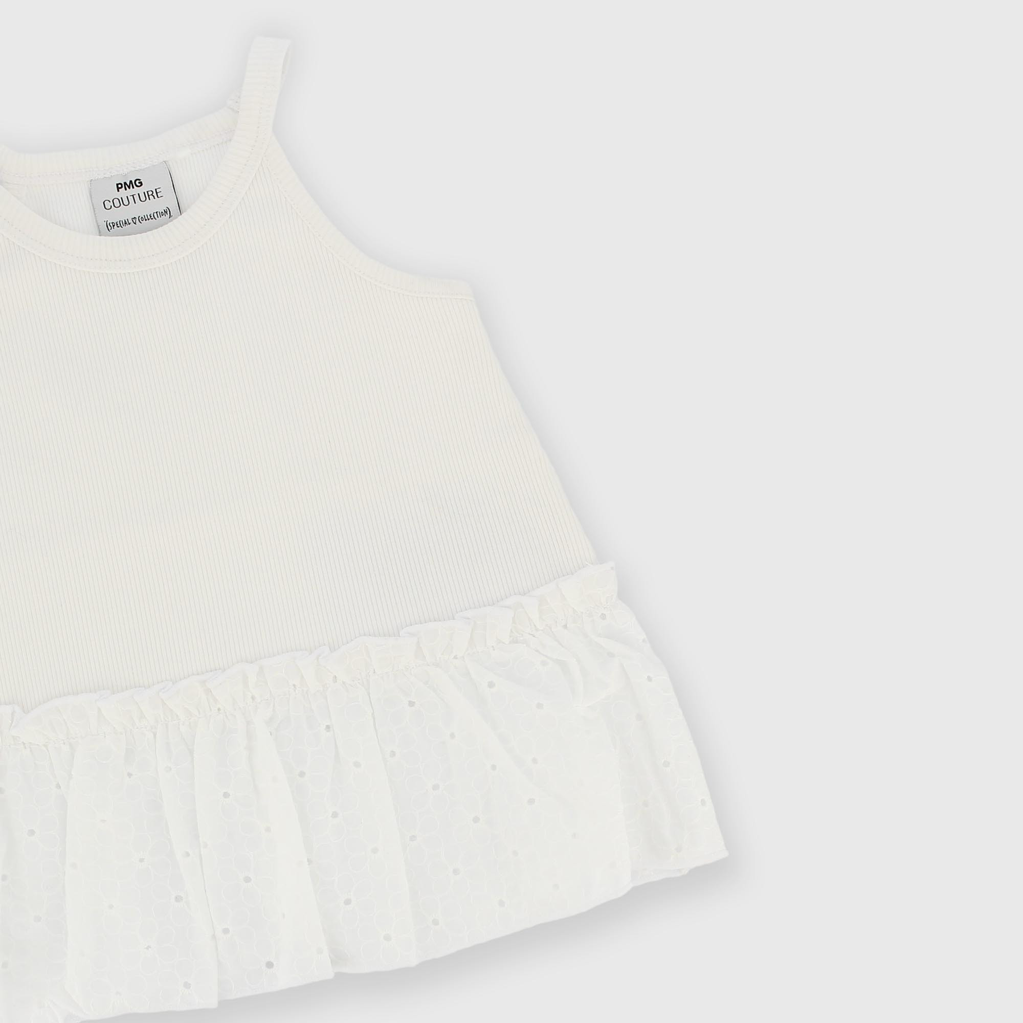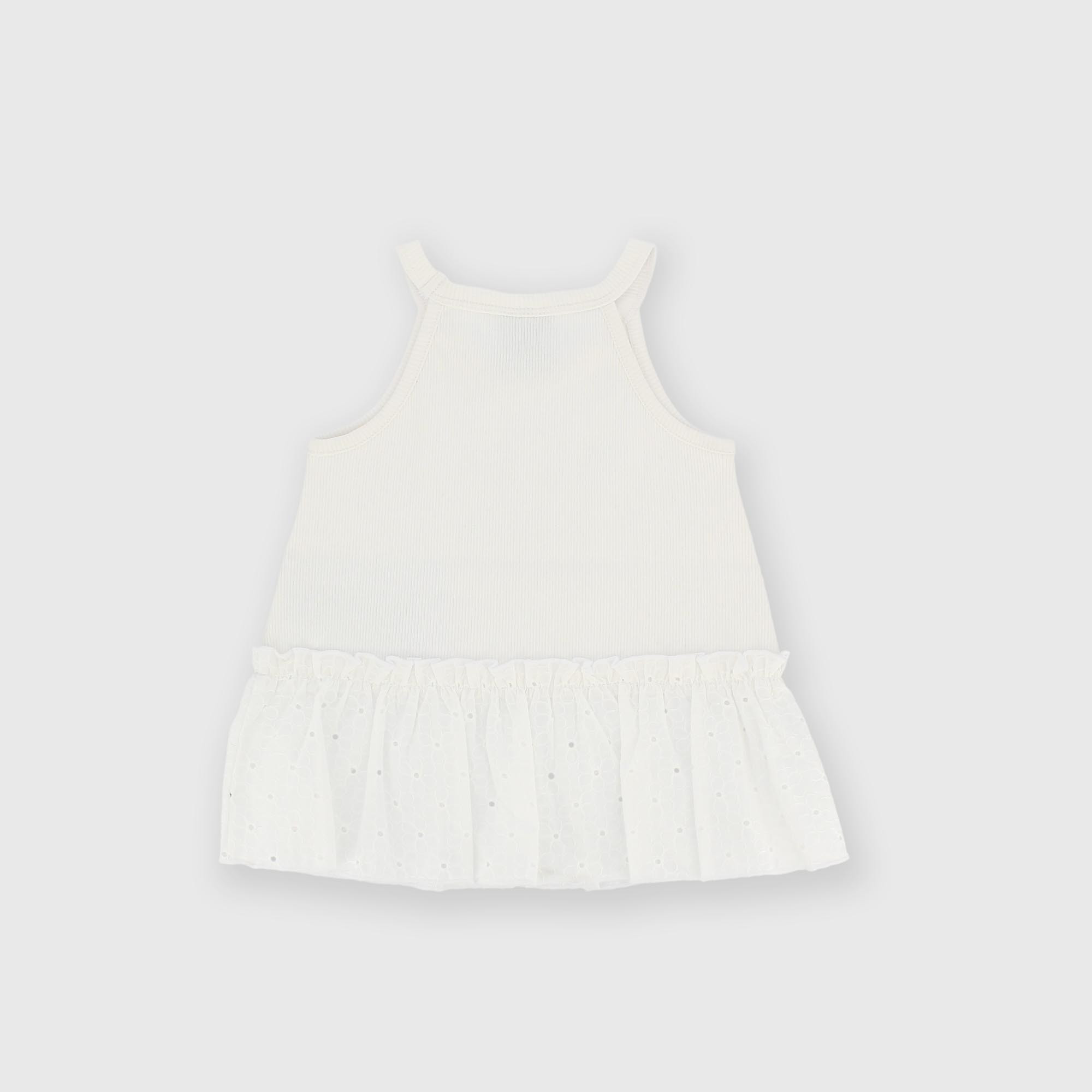 Débardeur côtelé avec encolure américaine et fines bretelles. Volant en dentelle San Gallo.