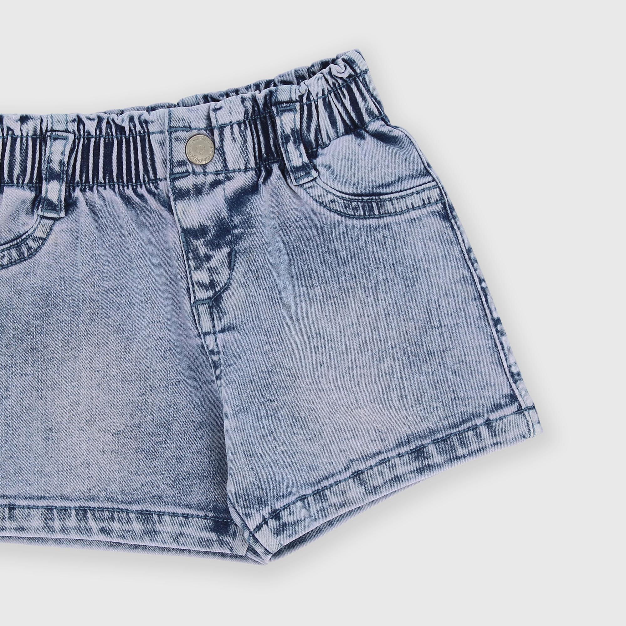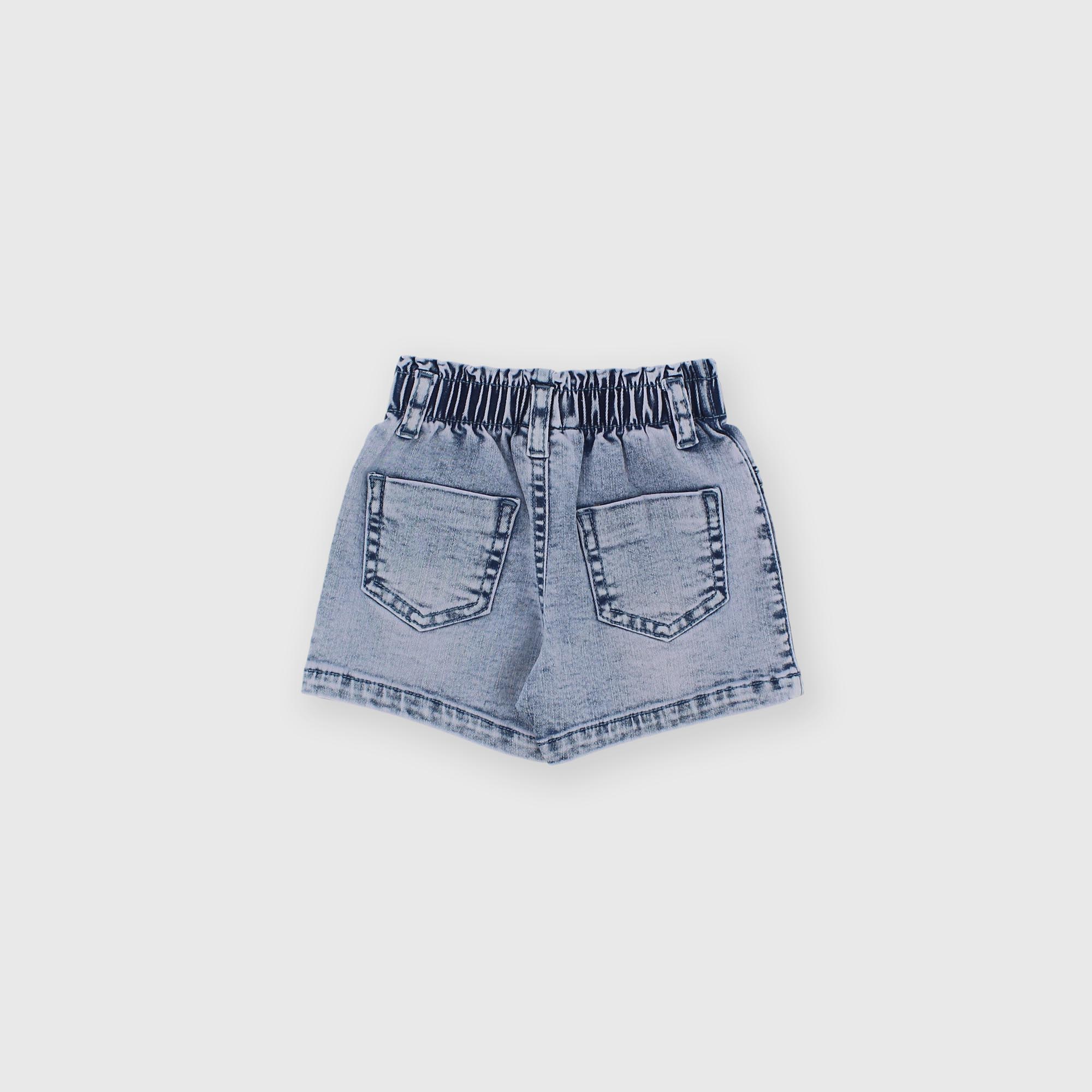 Shorts en jean avec taille élastique et passants. Fermeture avec petit bouton automatique. Fausses poches à l'avant et poche plaquée à l'arrière.