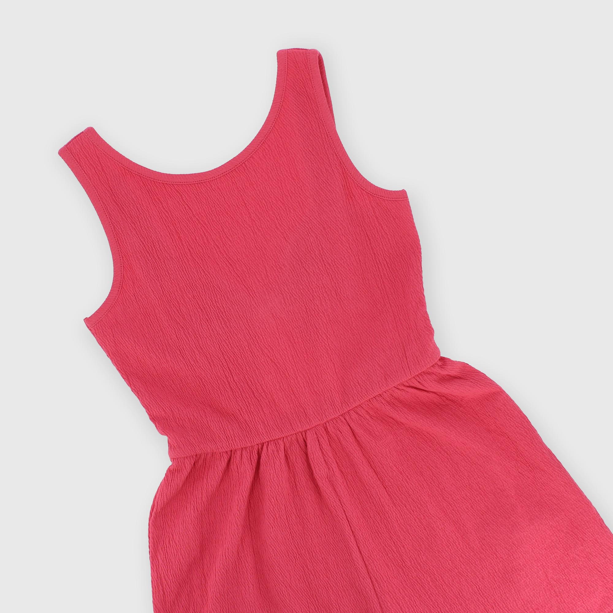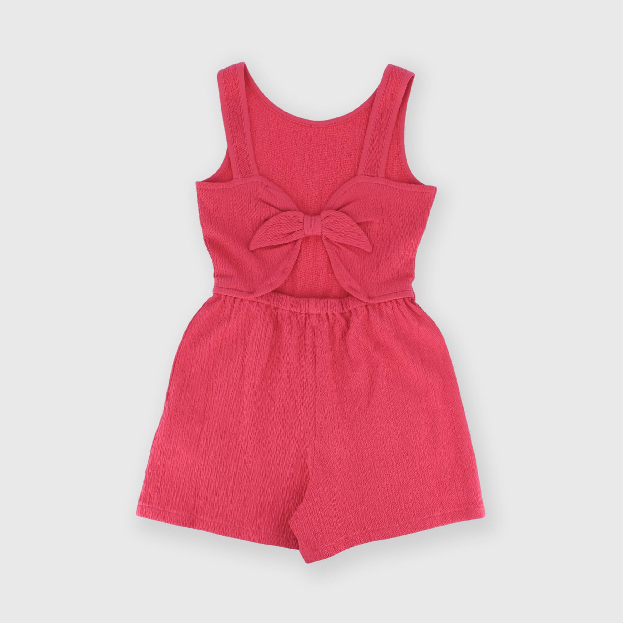 Salopette en seersucker, encolure ronde, avec bretelles. Ouverture à l'arrière avec nœud appliqué.