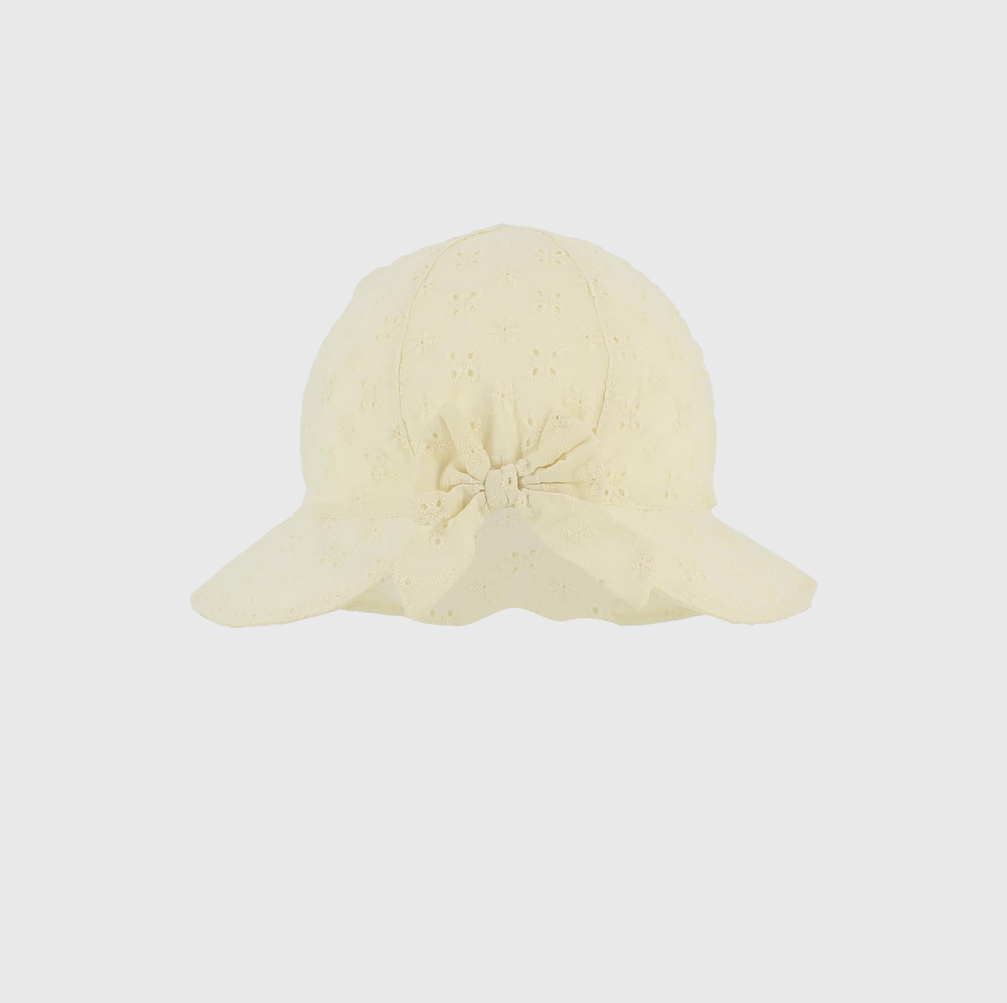 Chapeau en dentelle Sant-Gallo avec petit nœud appliqué. Élastique à l'arrière.