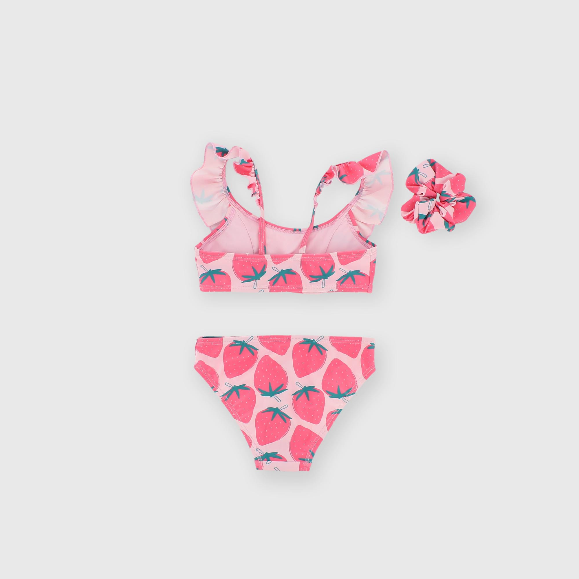 Bikini imprimé avec top et culotte assortis. Volants sur les bretelles. Chouchou assorti. Motif fraises.