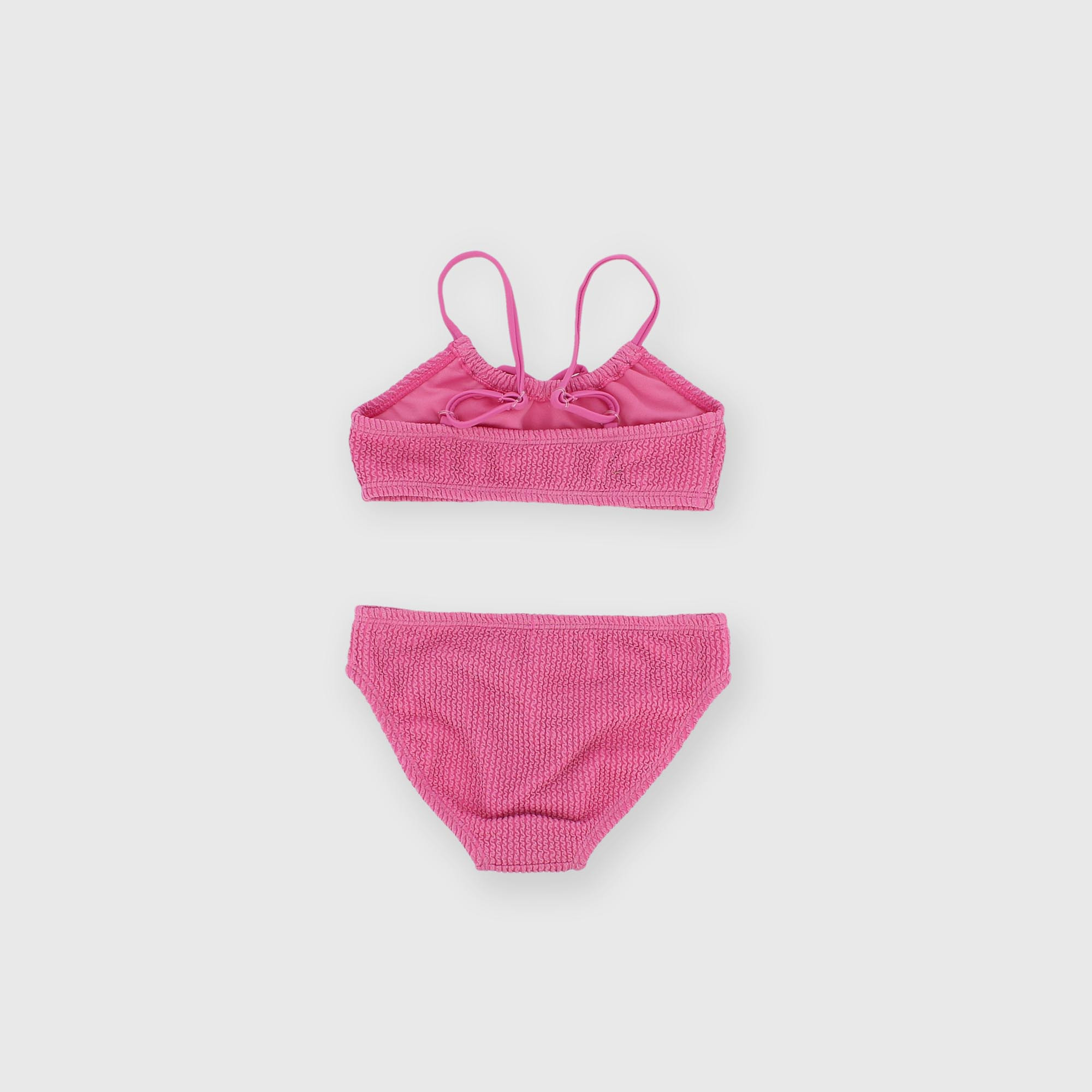 Bikini en lurex avec top et culotte assortis. Top avec fines bretelles et petit nœud appliqué devant.