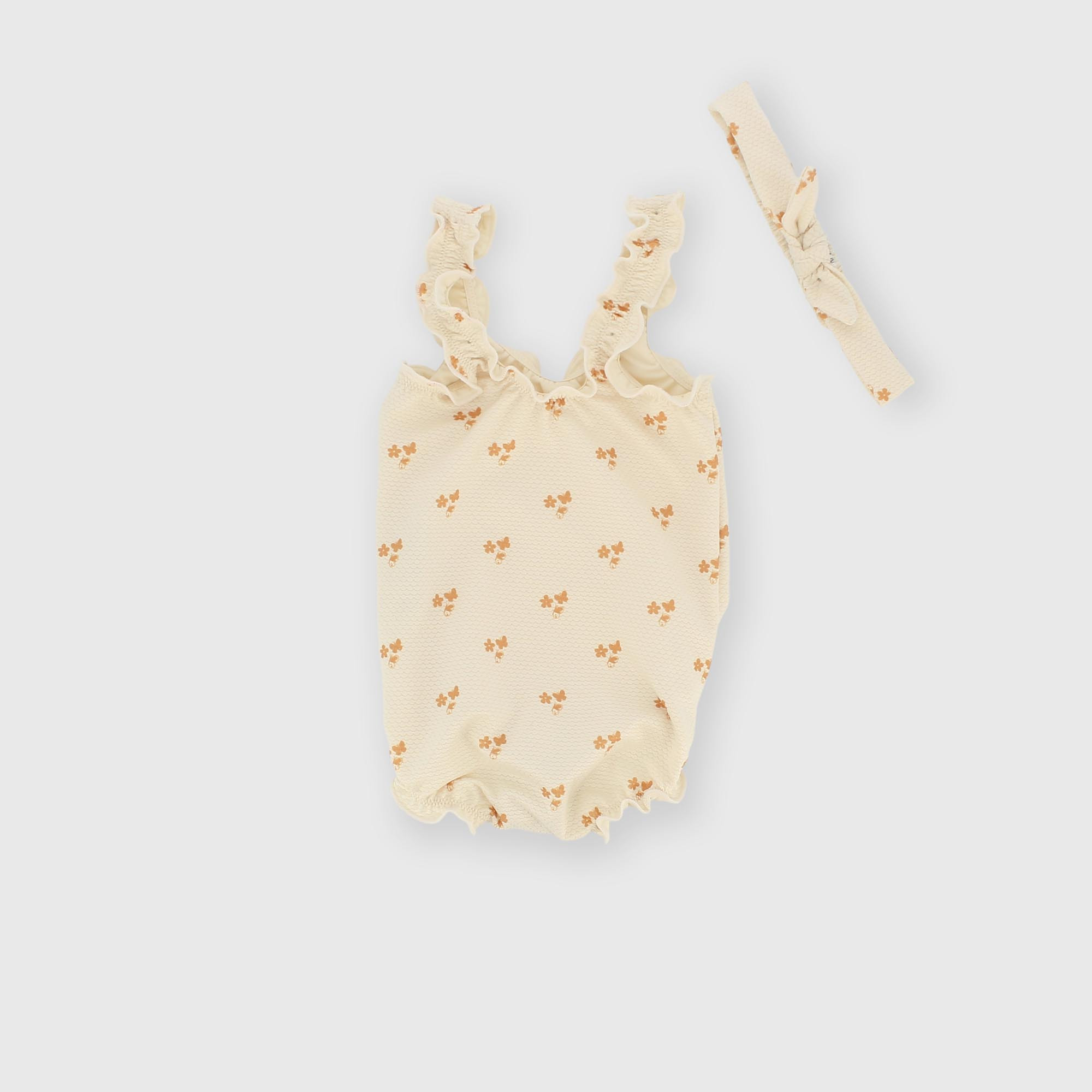 Maillot une pièce avec bande pour cheveux assortie. Motif à petites fleurs.