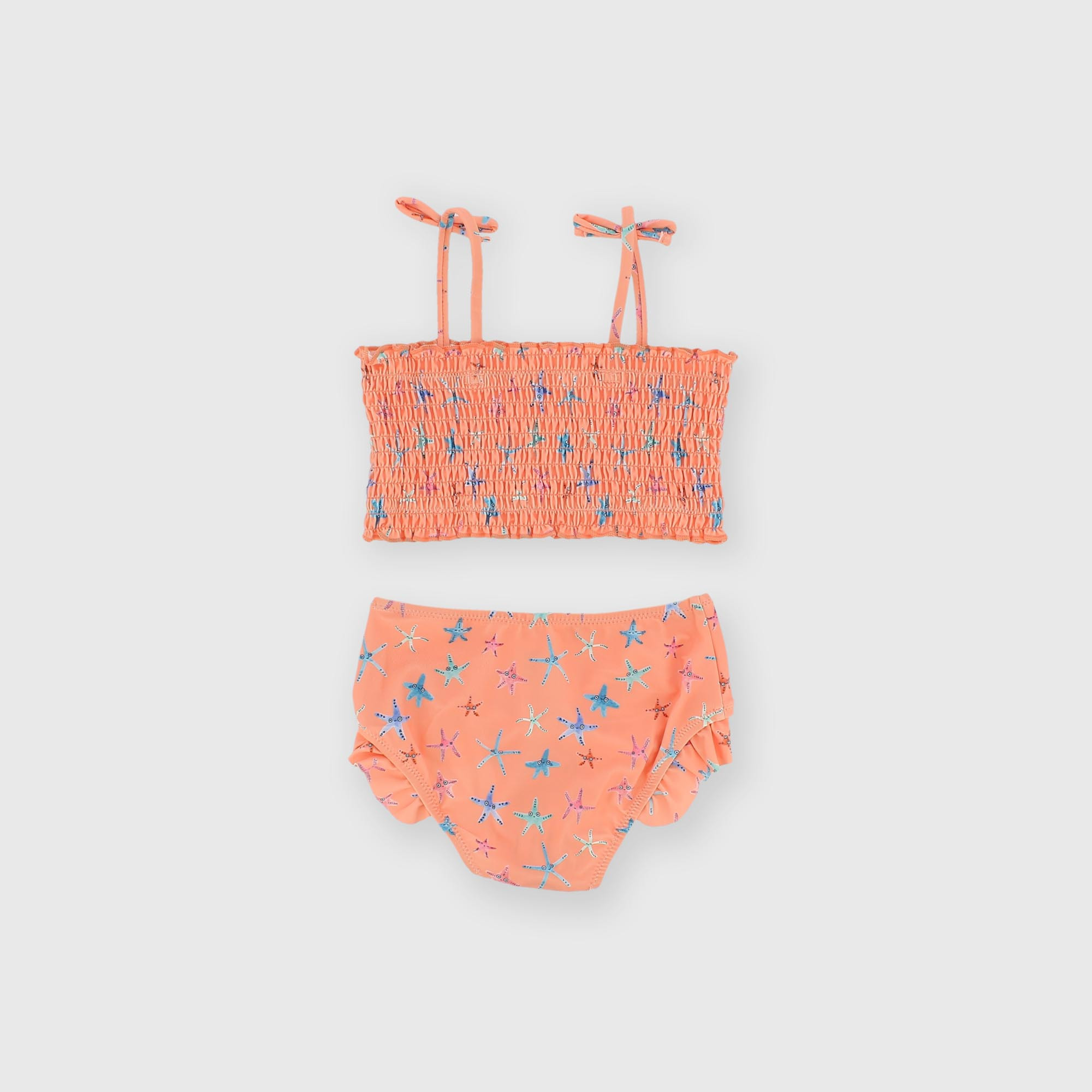 Bikini avec top et slip assortis. Top avec fines bretelles, petit nœud et surpiqûres élastiquées. Slip avec taille élastiquée. Motif étoiles de mer.