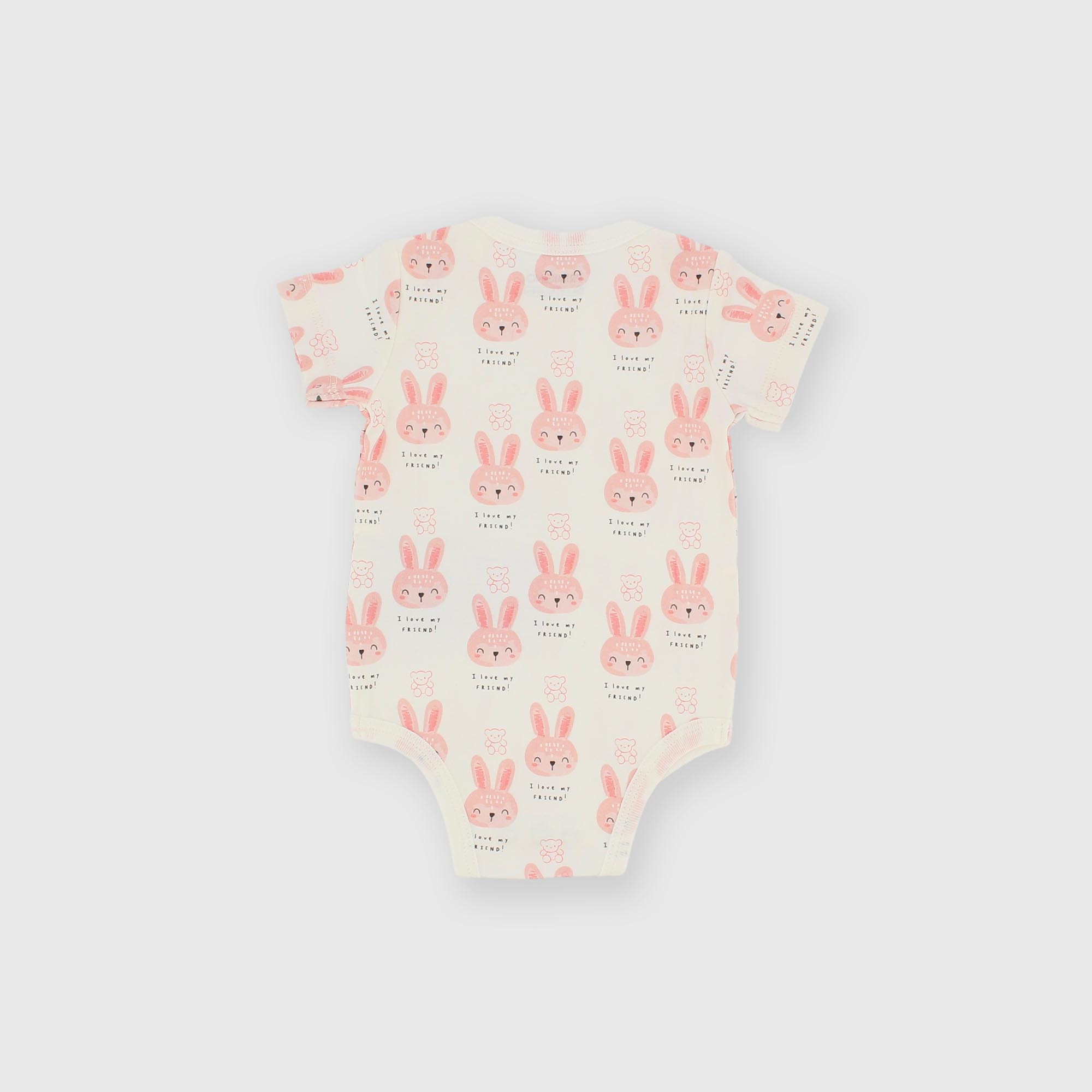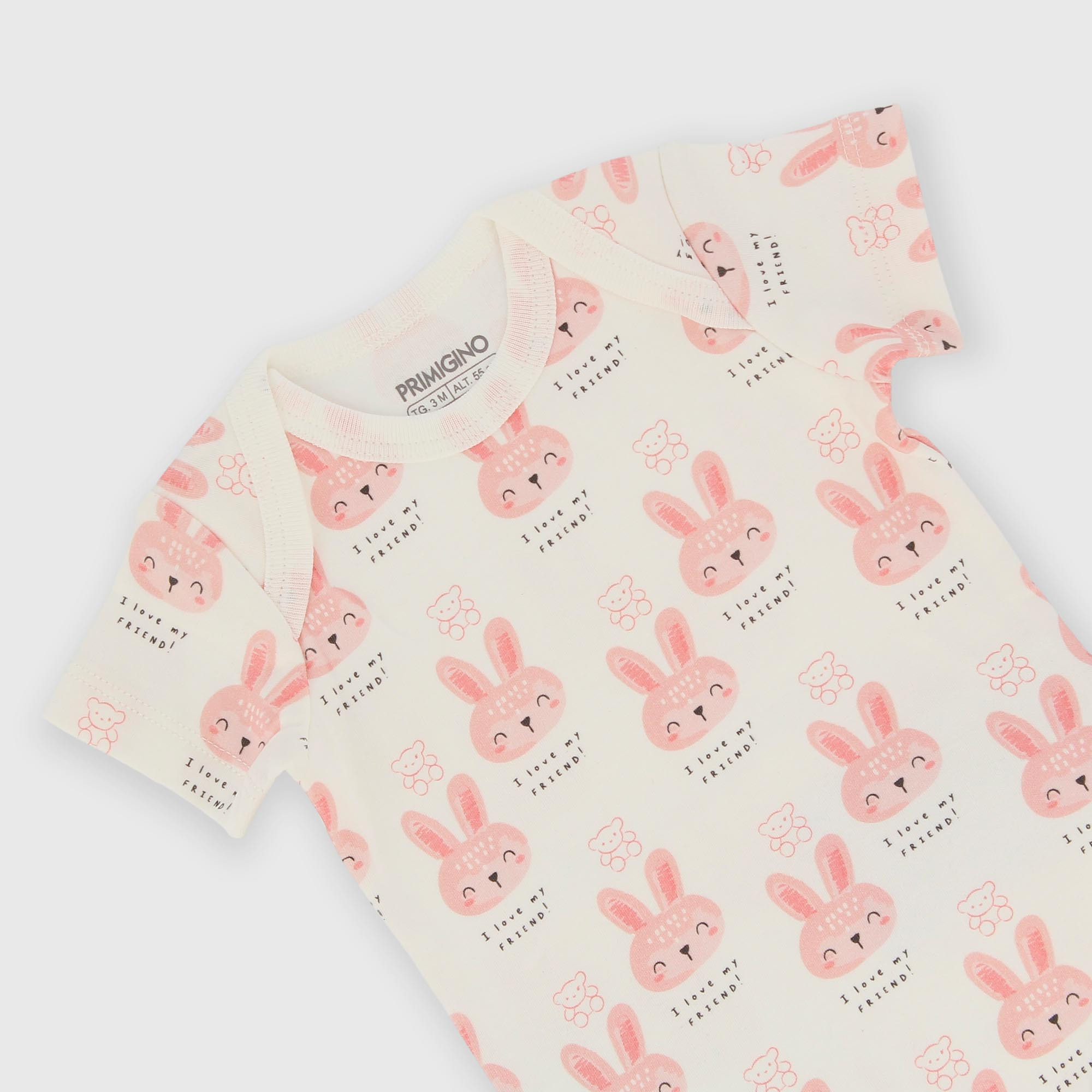 Combinaison côtelée, ras de cou, manches courtes. Boutons pression sur le bas. Imprimé all-over.