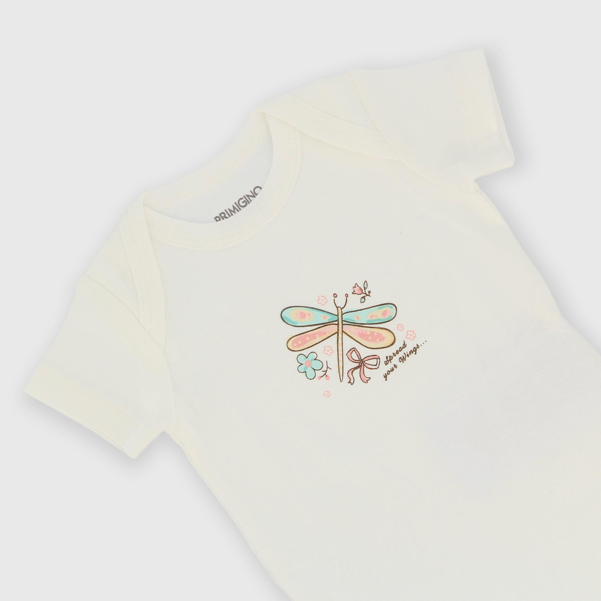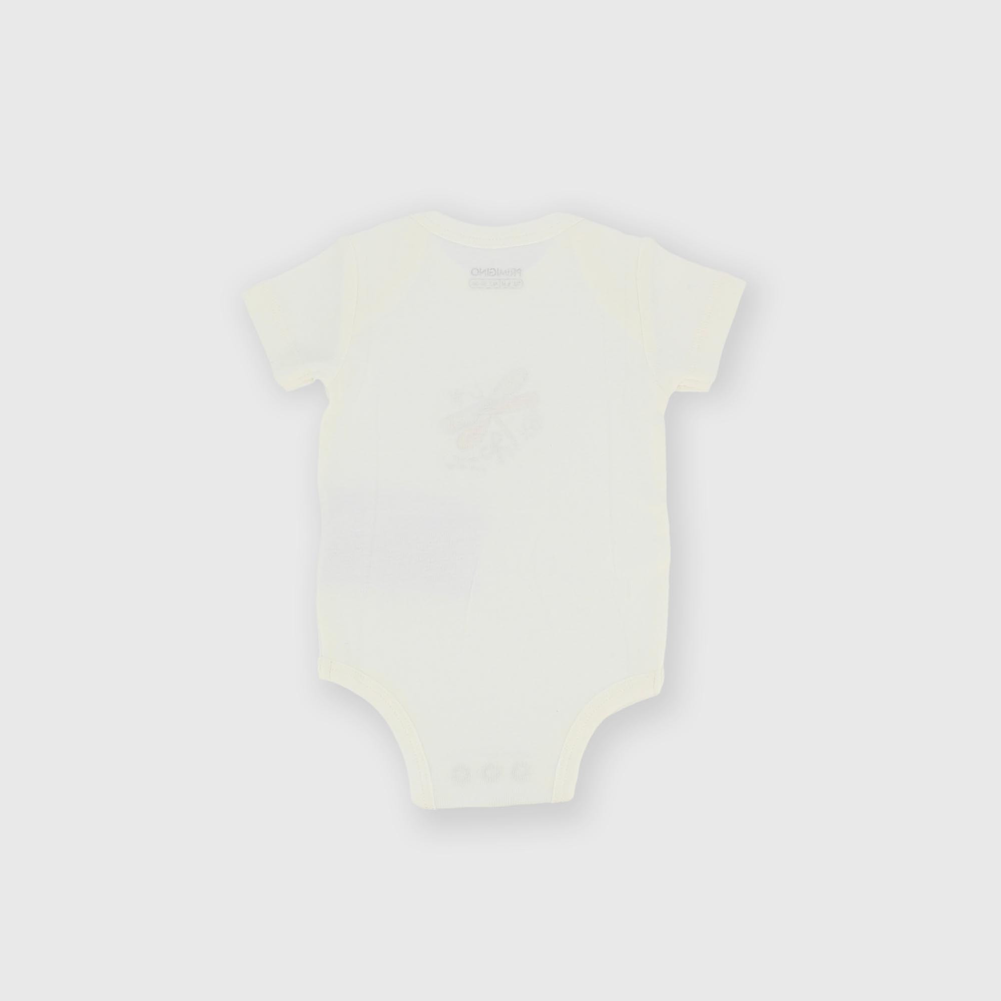 Combinaison côtelée, ras de cou, manches courtes. Boutons pression sur le bas. Imprimé devant.