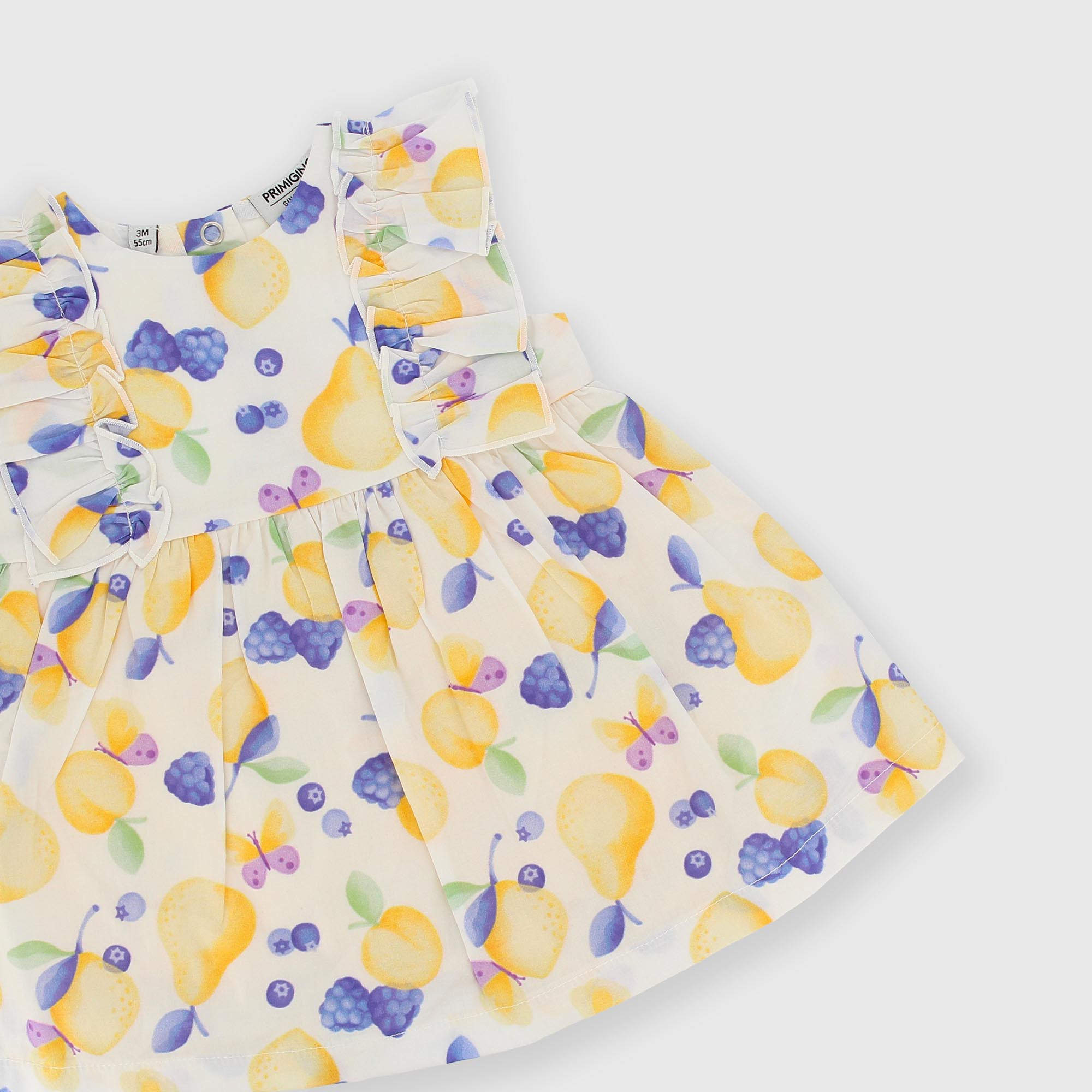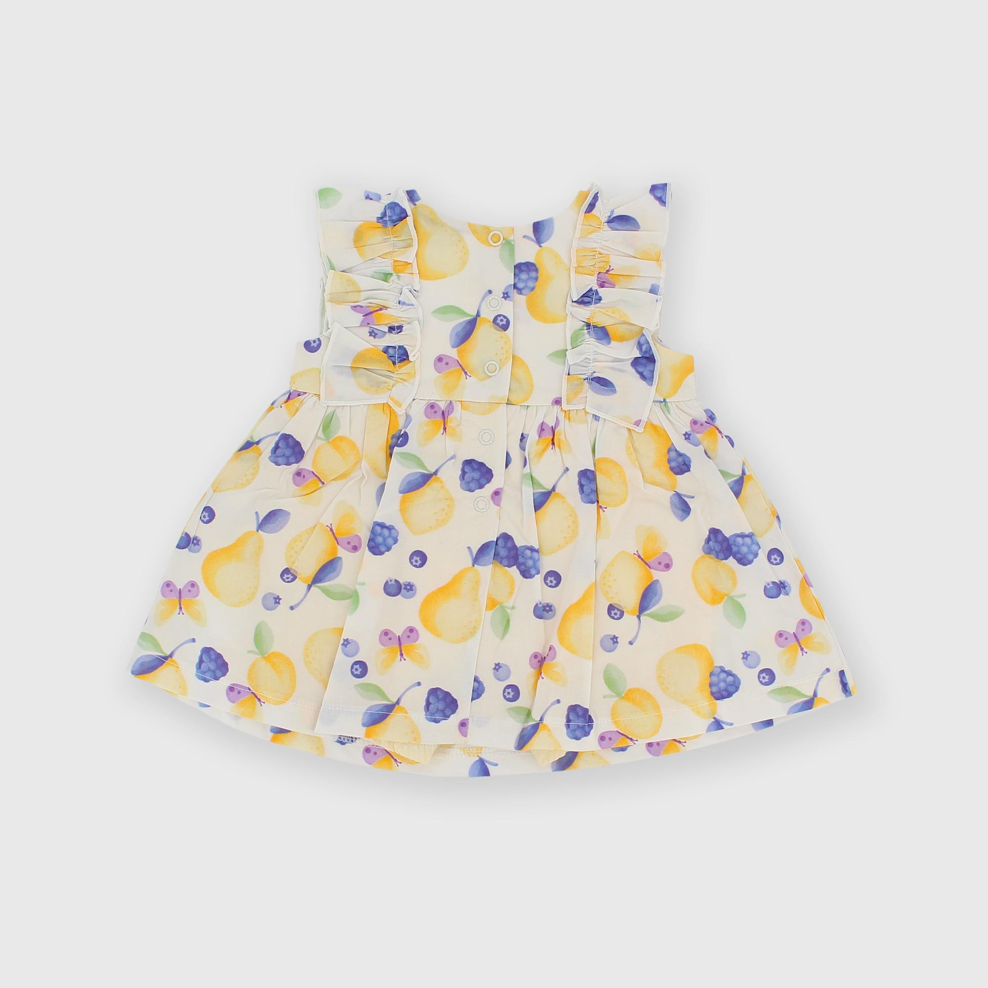 Combinaison en coton, col rond, sans manches. Fermeture par boutons-pression à l'arrière et sur l'entrejambe. Volants sur les épaules. Imprimé fruits sur toute la surface.