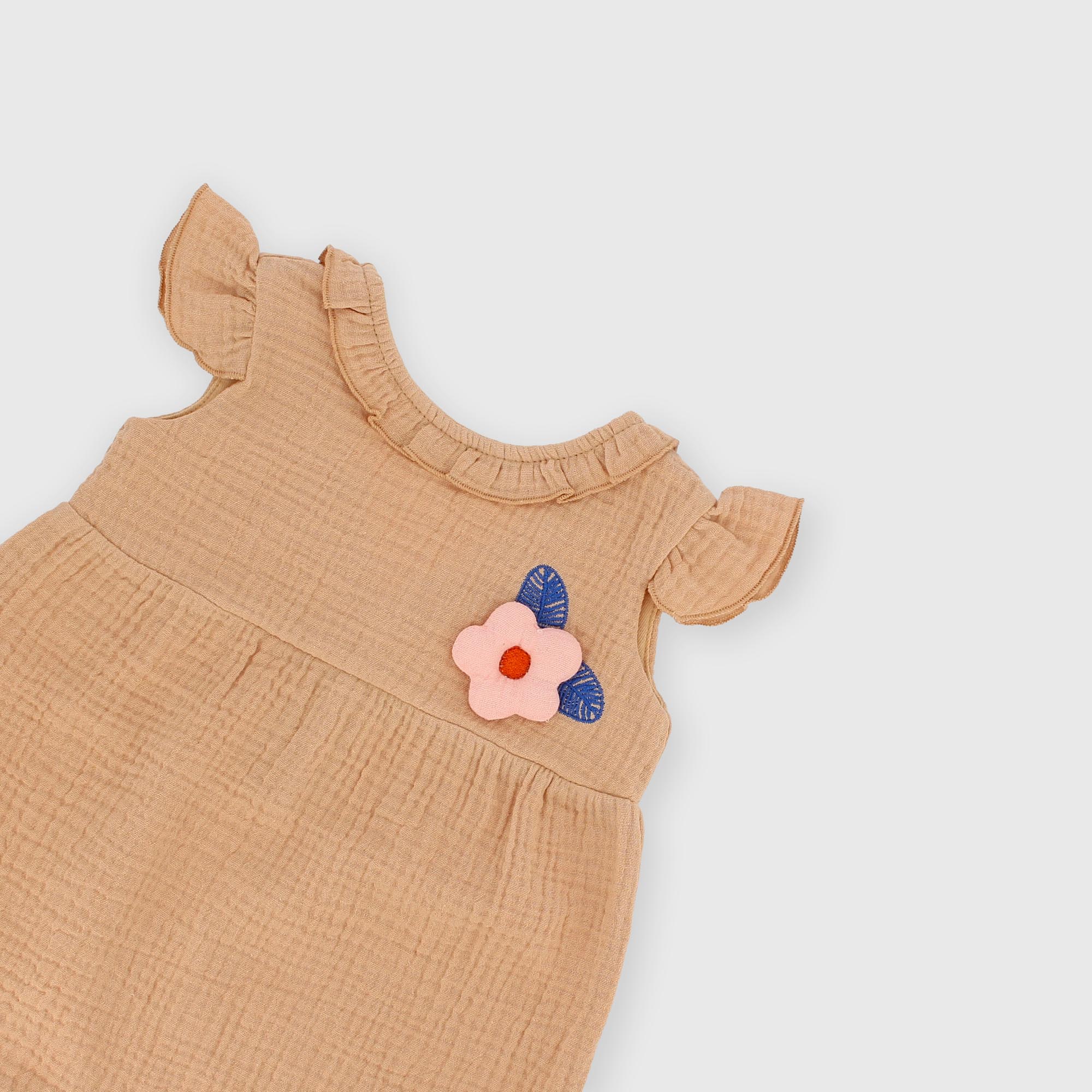 Barboteuse en gaze de coton, col rond, sans manches. Fermeture à l'arrière et sur l'entrejambe avec des boutons. Volants sur les épaules et sur le décolleté. Fleur appliquée sur la poitrine.