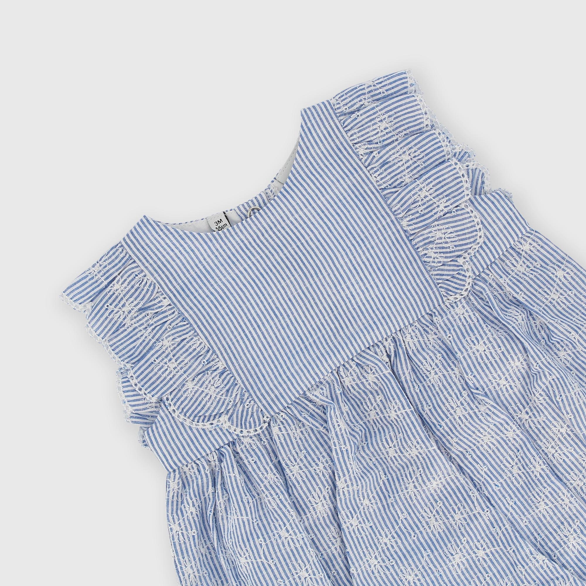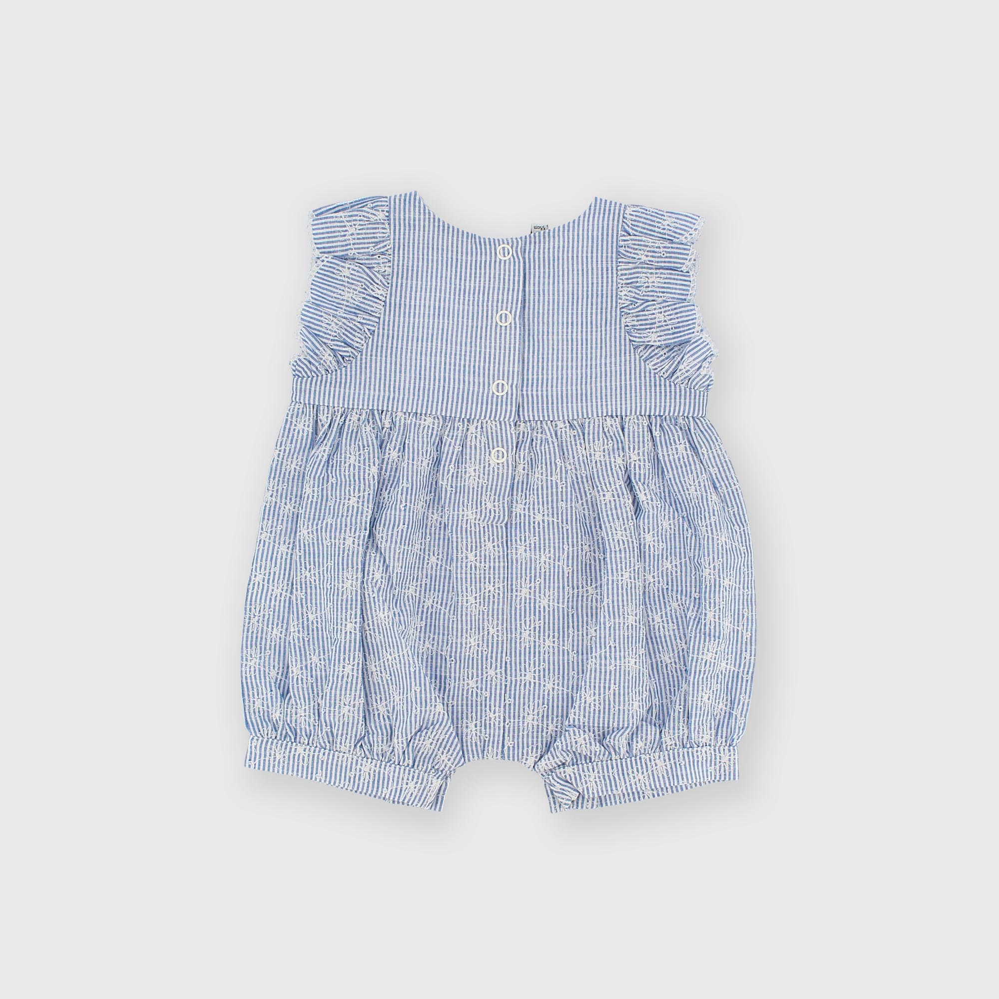 Barboteuse brodée, col rond, sans manches. Volants appliqués sur les épaules. Fermeture dans le dos et sur l'entrejambe avec des boutons pression.