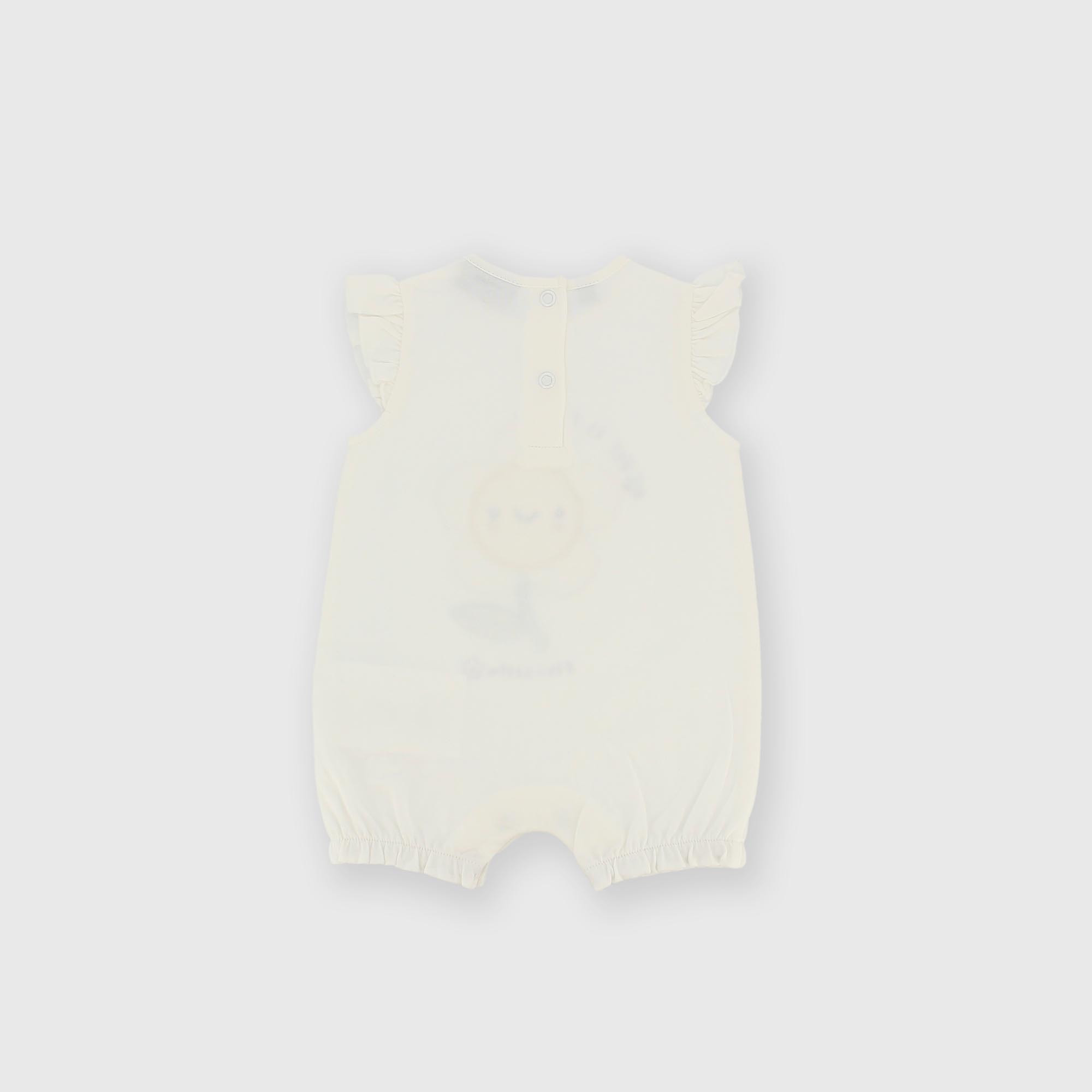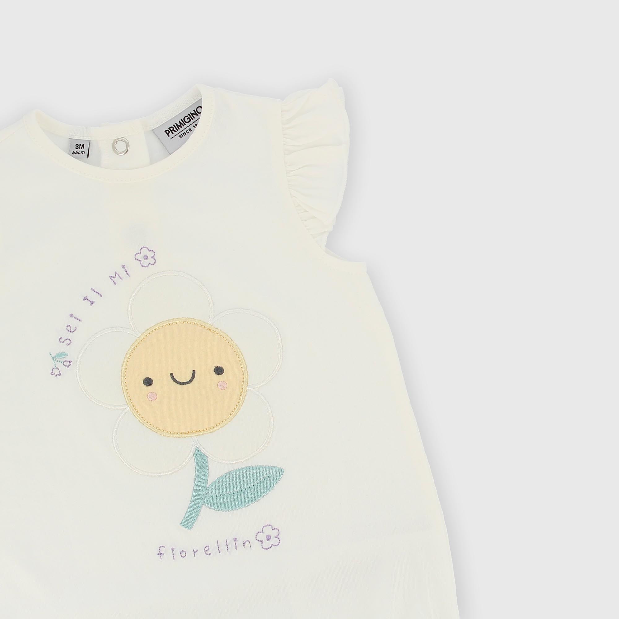 Body en jersey, col rond, sans manches. Volants sur les épaules. Boutons-pression à l'arrière et sur l'entrejambe. Fleur appliquée avec broderies sur le devant.