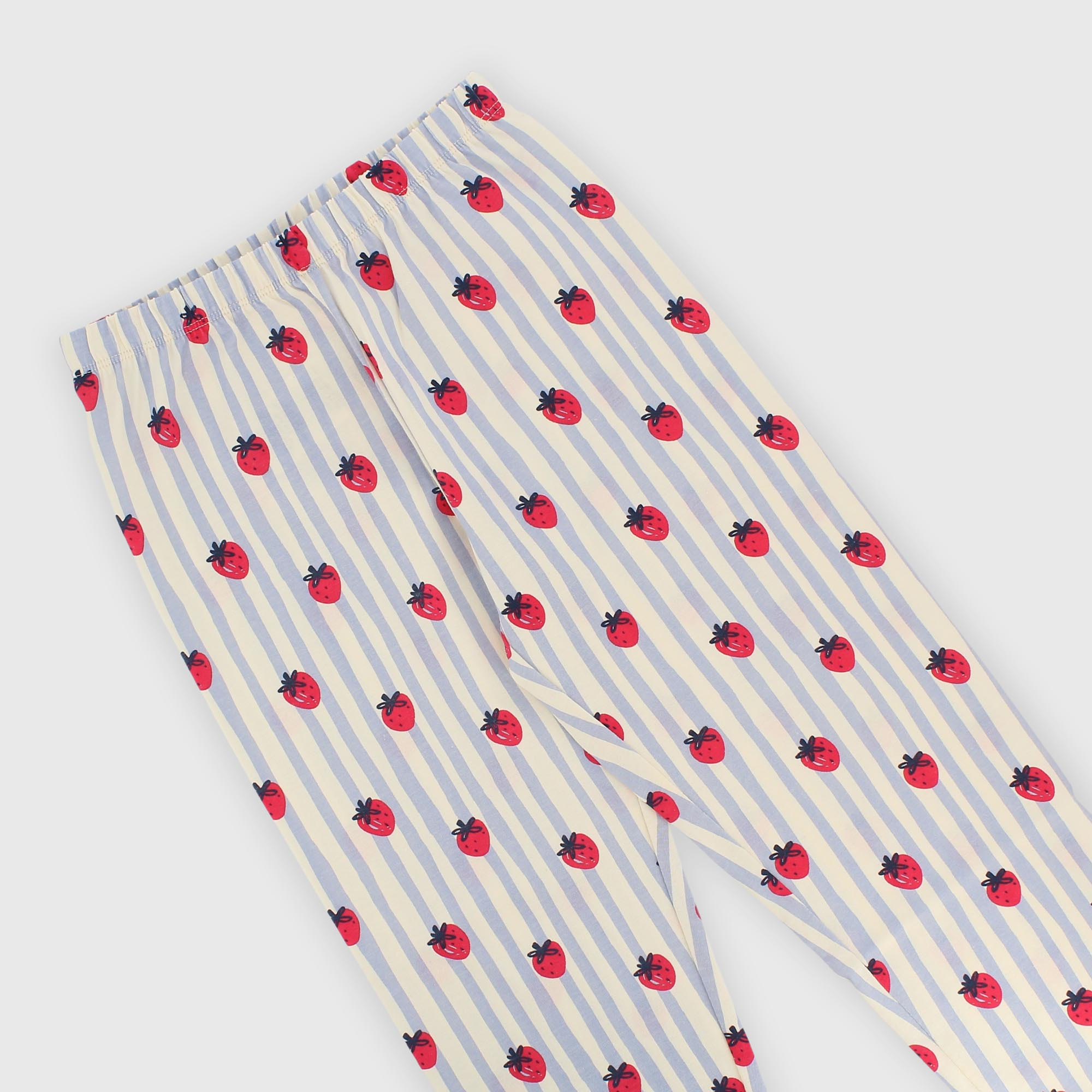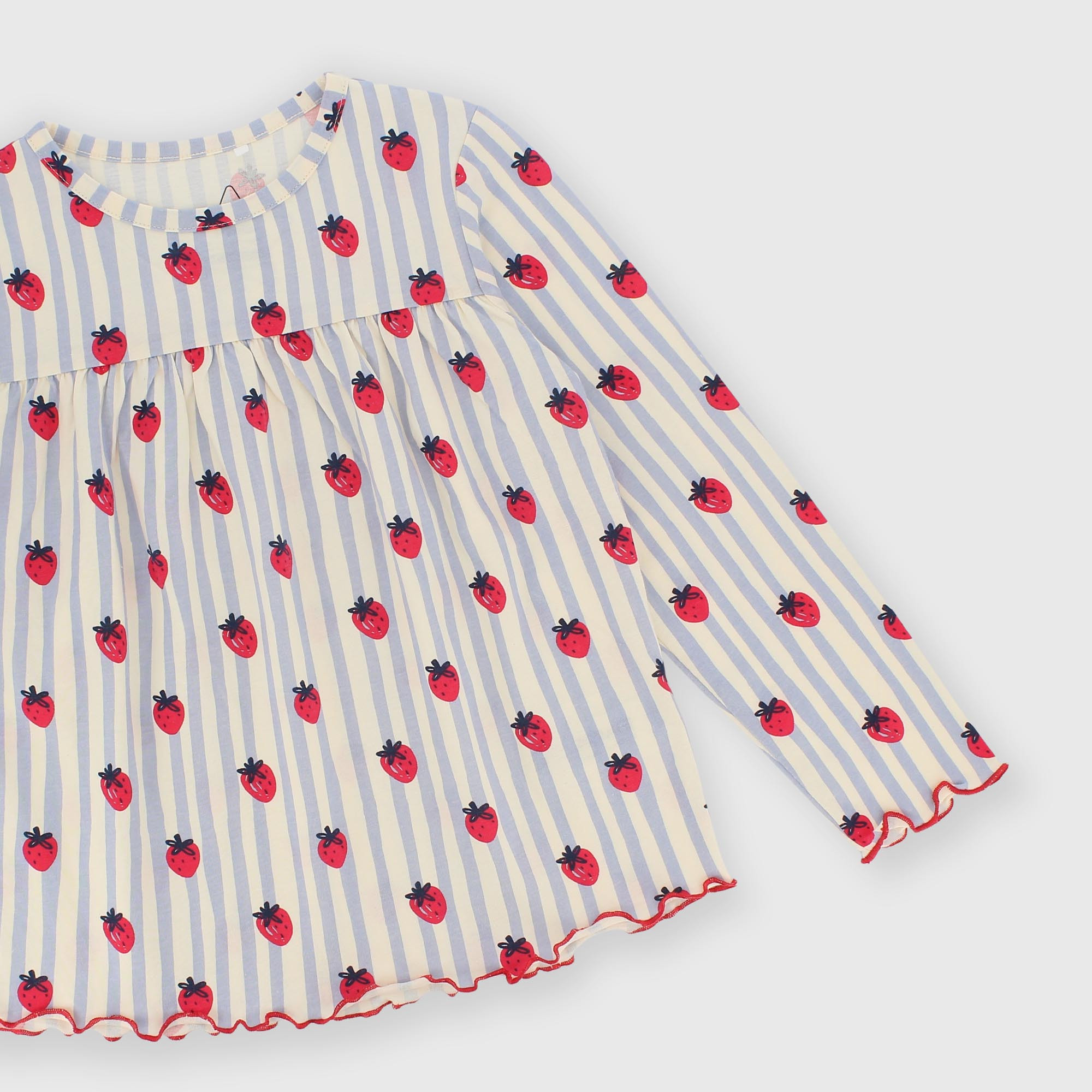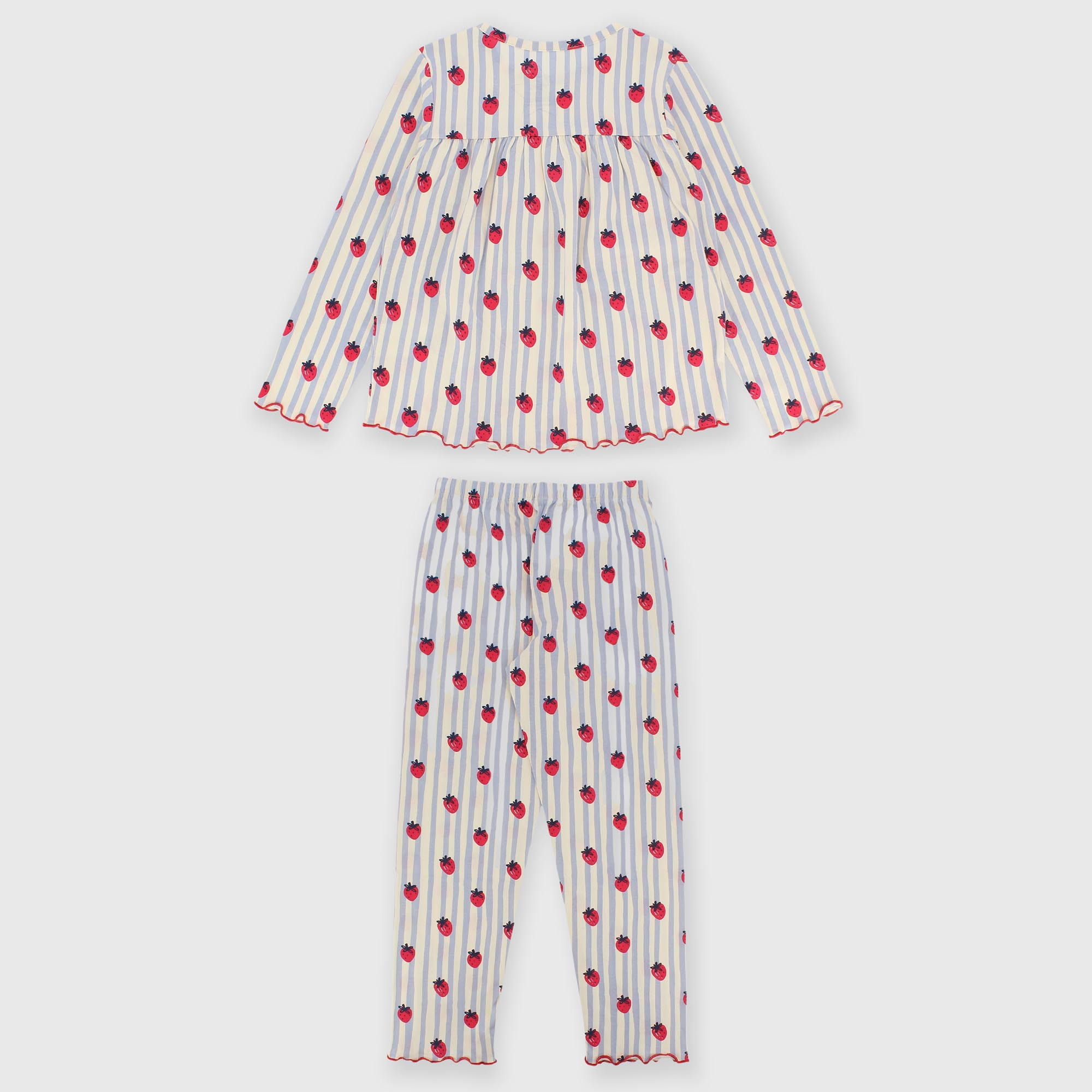 Ensemble pyjama en jersey avec imprimé intégral de rayures et fraises. T-shirt à col rond et manches longues. Pantalon avec taille élastiquée. Finitions points poupée.
