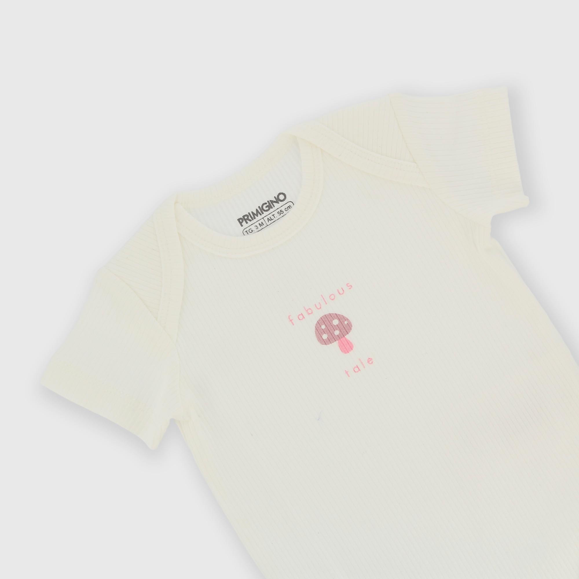 Body côtelé à col rond et manches courtes. Fermeture par boutons-pression en bas. Imprimé champignon sur le devant.