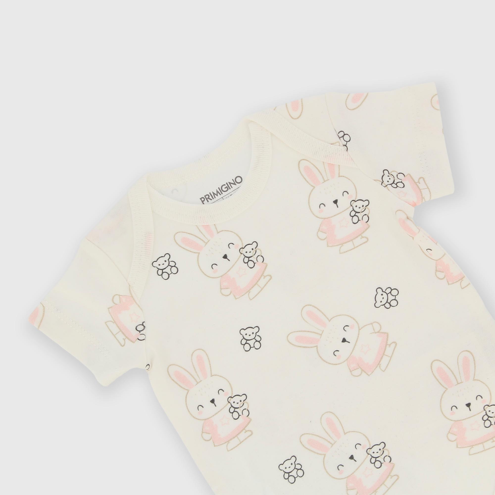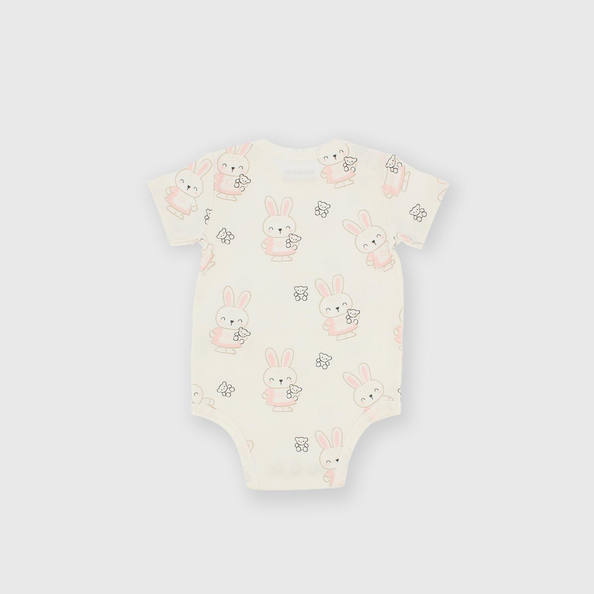 Body en coton chaud, col rond et manches courtes. Fermeture par boutons-pression en bas. Imprimé intégral avec lapins et ours.