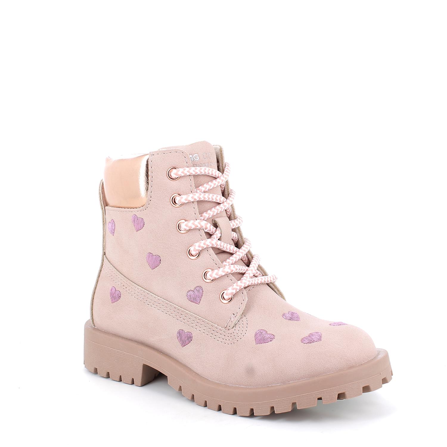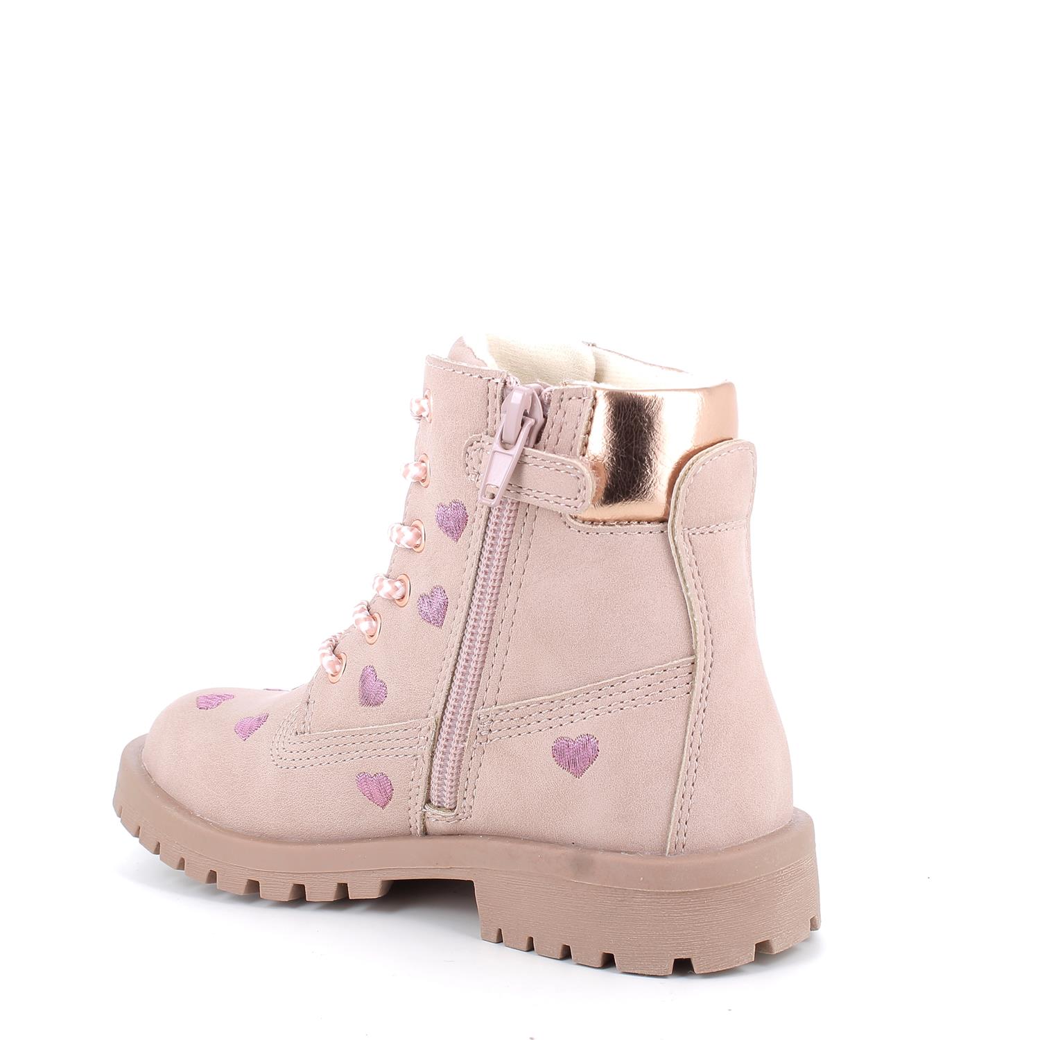 Ces boots allient caractère et douceur en un seul instant : la tige est ornée de petits cœurs brodés qui dégagent du romantisme, tandis que la semelle crantée offre solidité et un pas sûr même lors des journées les plus aventureuses. Les lacets sont embellis par des micro-détails scintillants et une fermeture éclair pratique est également présente. Le col métallisé ajoute une touche fashion qui ne passe pas inaperçue. Parfaites pour vivre l'école, les après-midis au parc ou des week-ends en famille avec style et caractère, ces bottines transforment chaque tenue en un mélange de féminité et d'attitude urbaine.