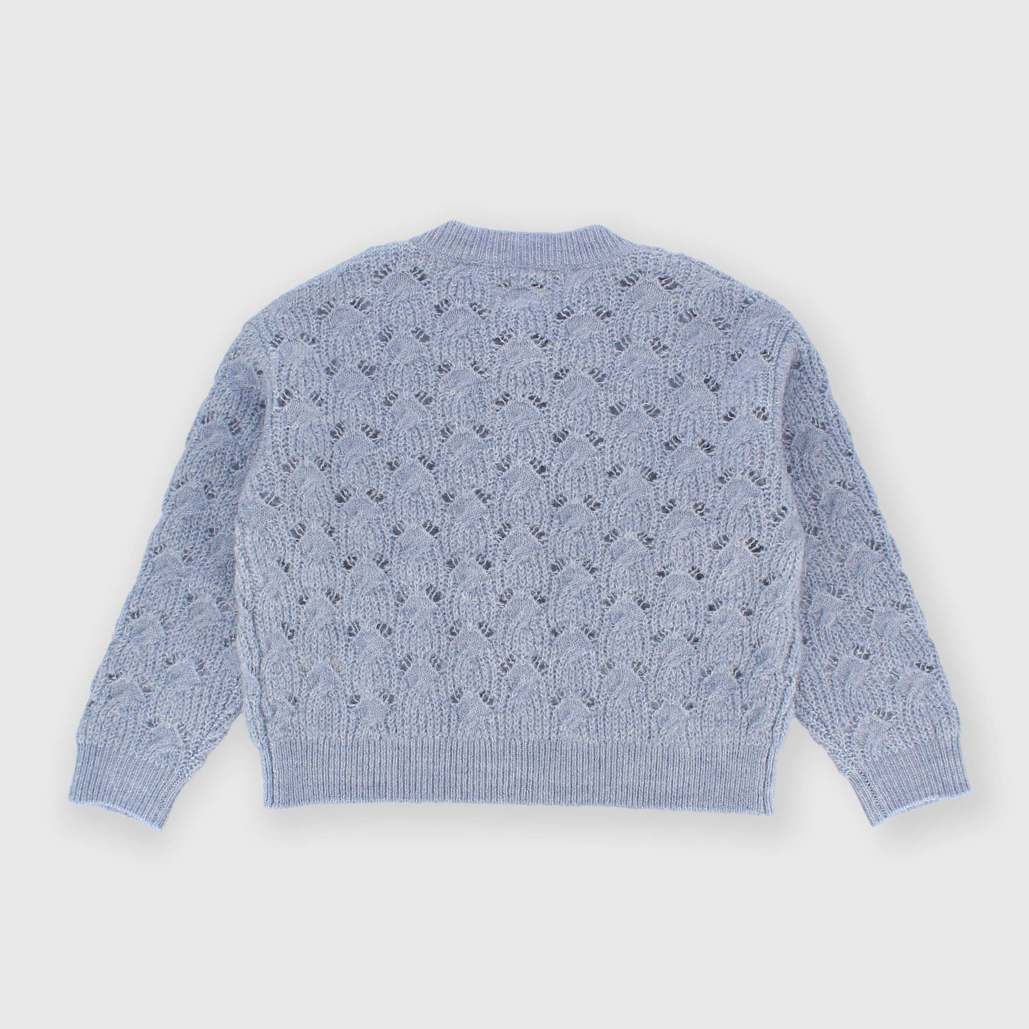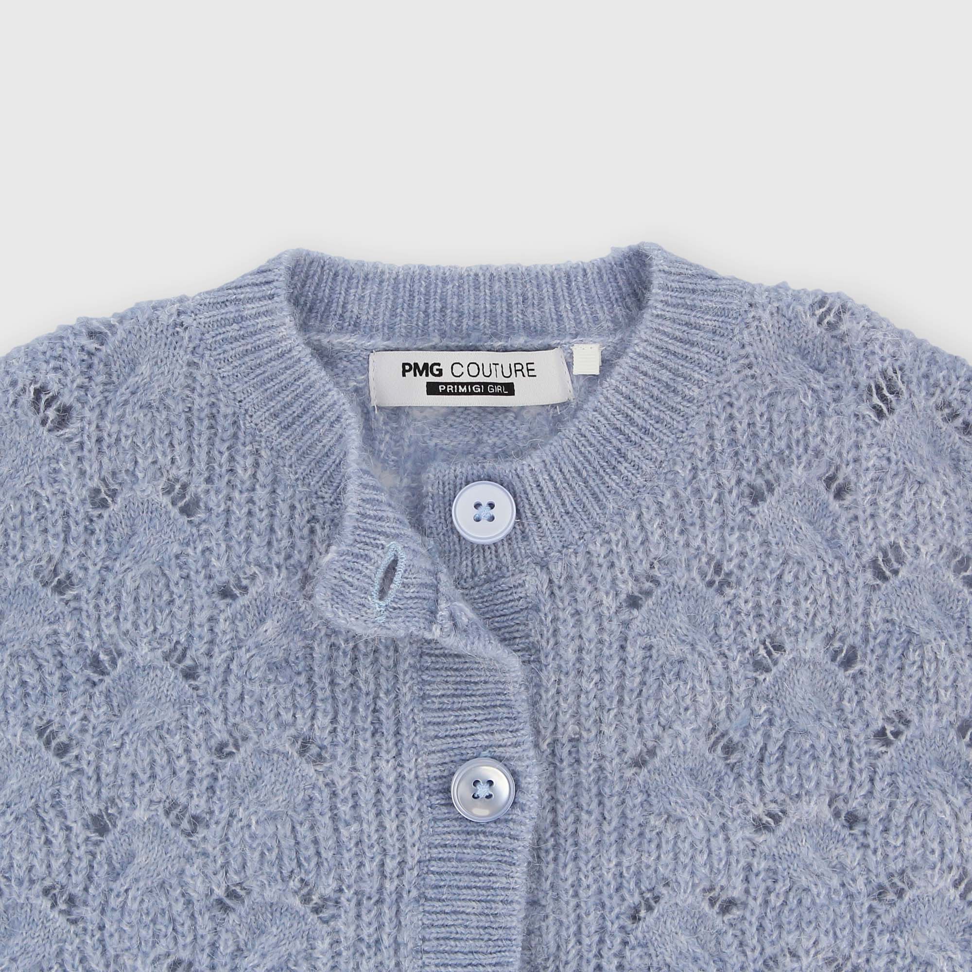 Cardigan en maille douce ajourée, col rond, manches longues. Fermeture boutonnée sur le devant.