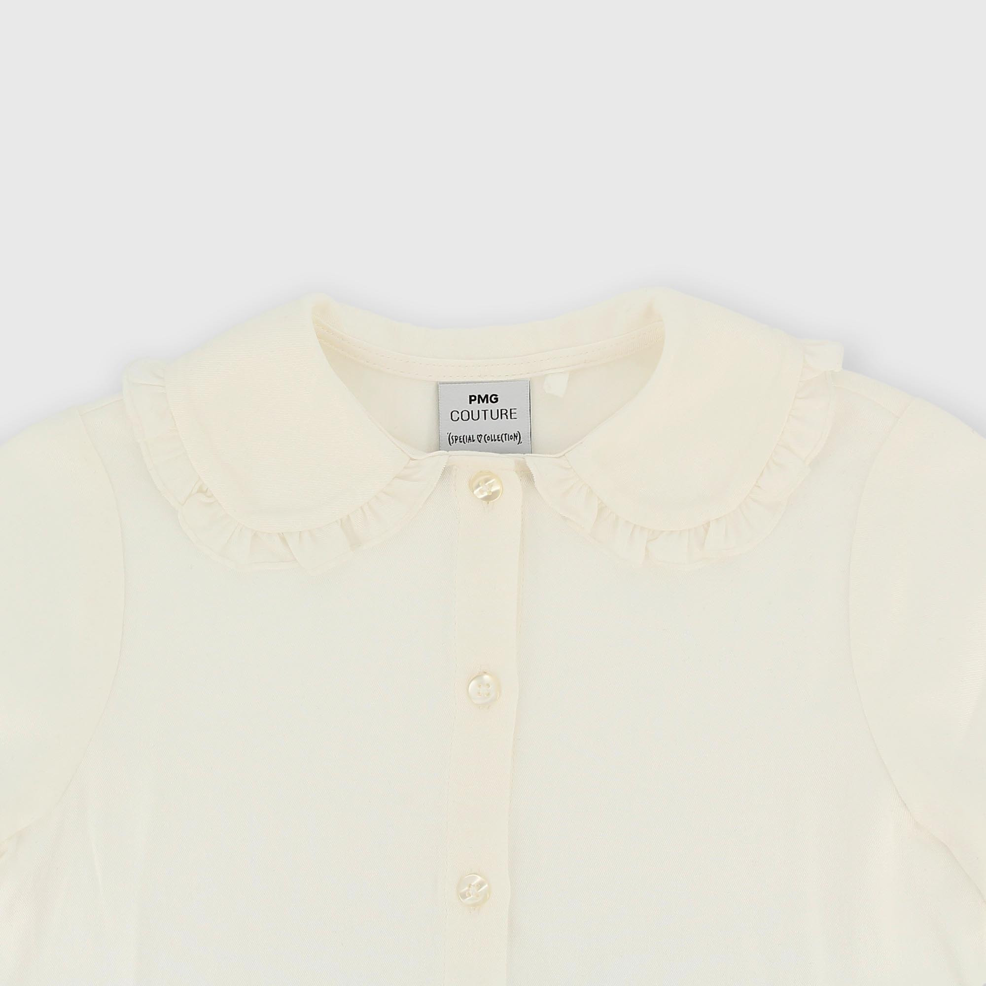Chemise en popeline à manches longues. Fermeture boutonnée sur le devant. Col large avec volants sur le bord. Poignets élastiqués.