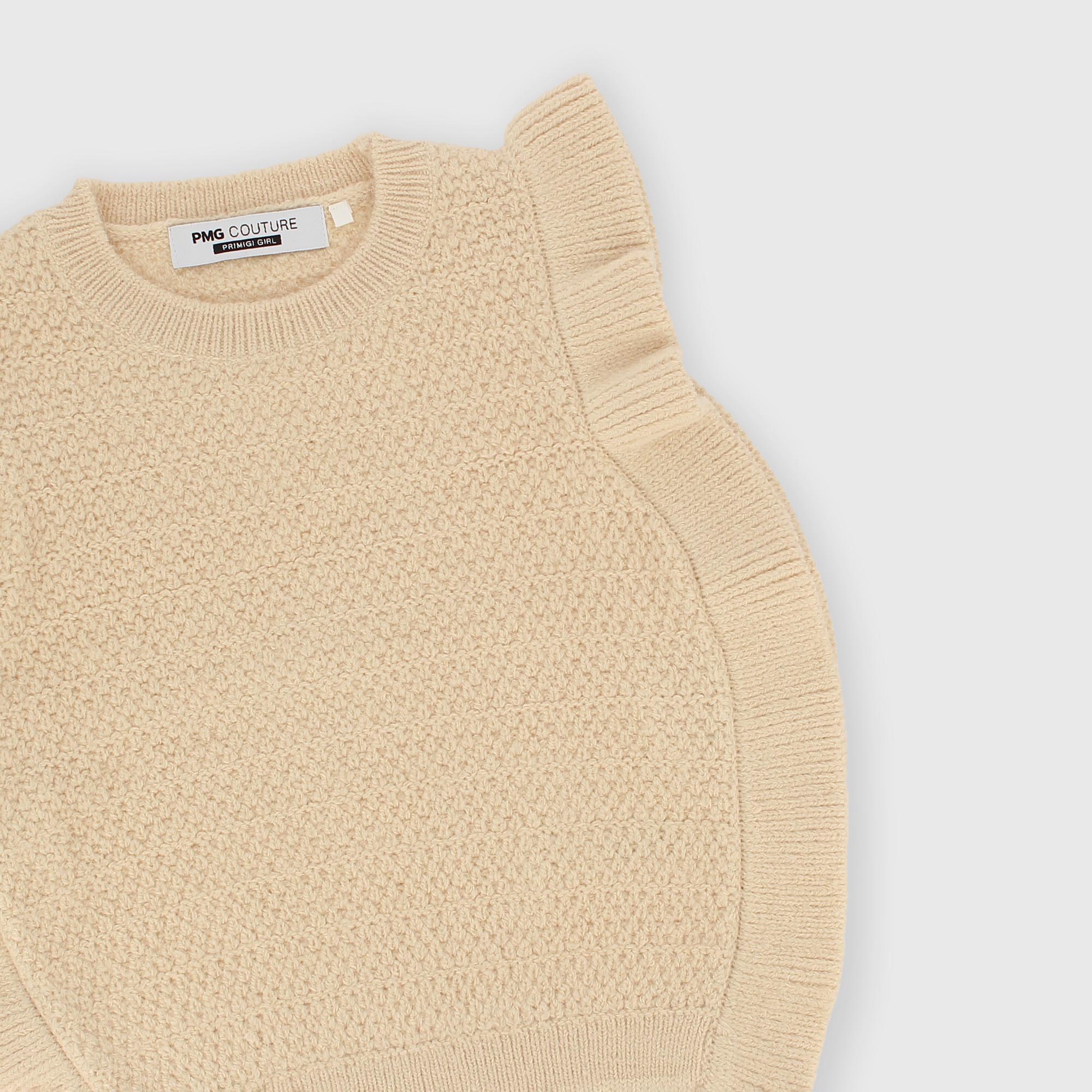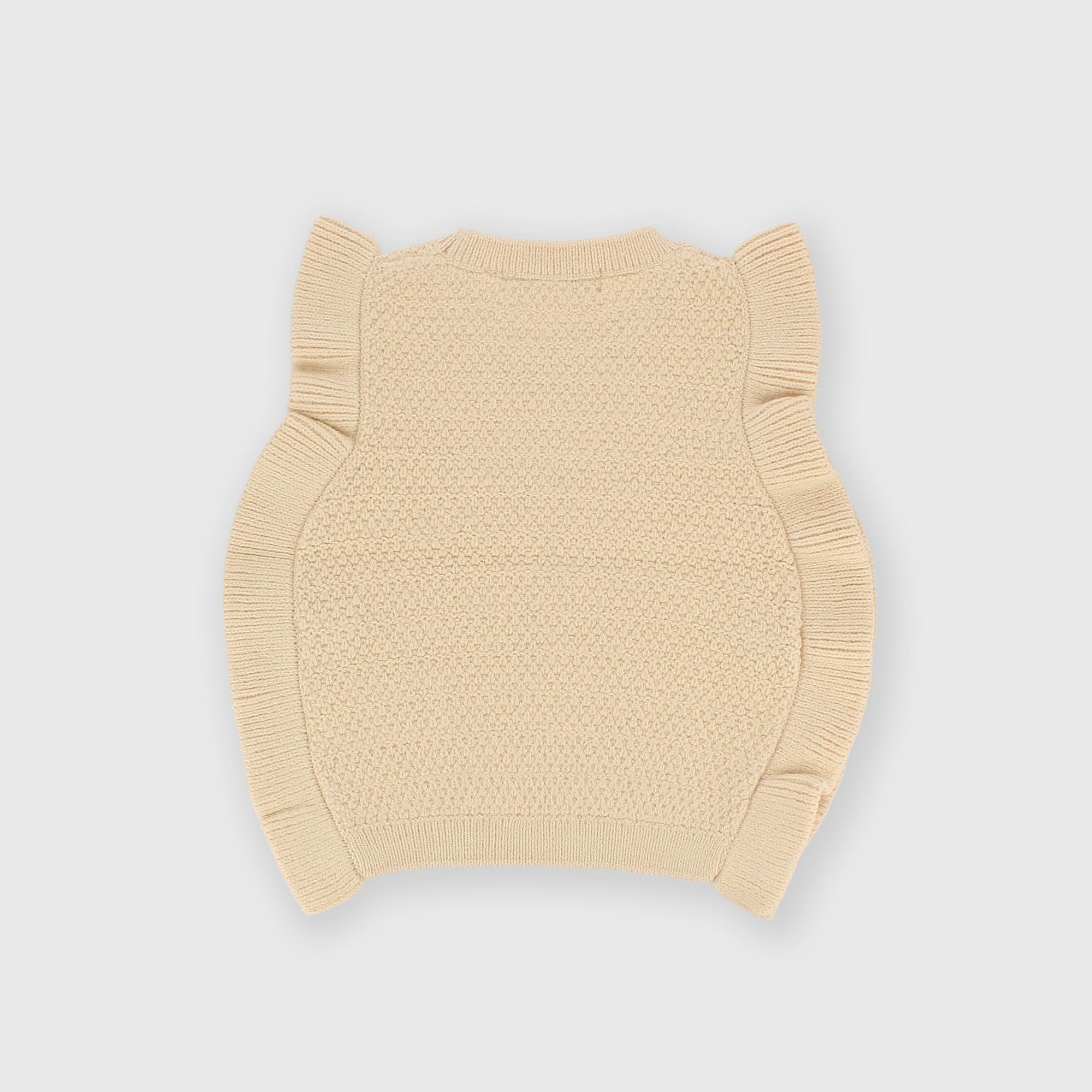 Gilet tricoté doux, col rond. Volants sur les bords.