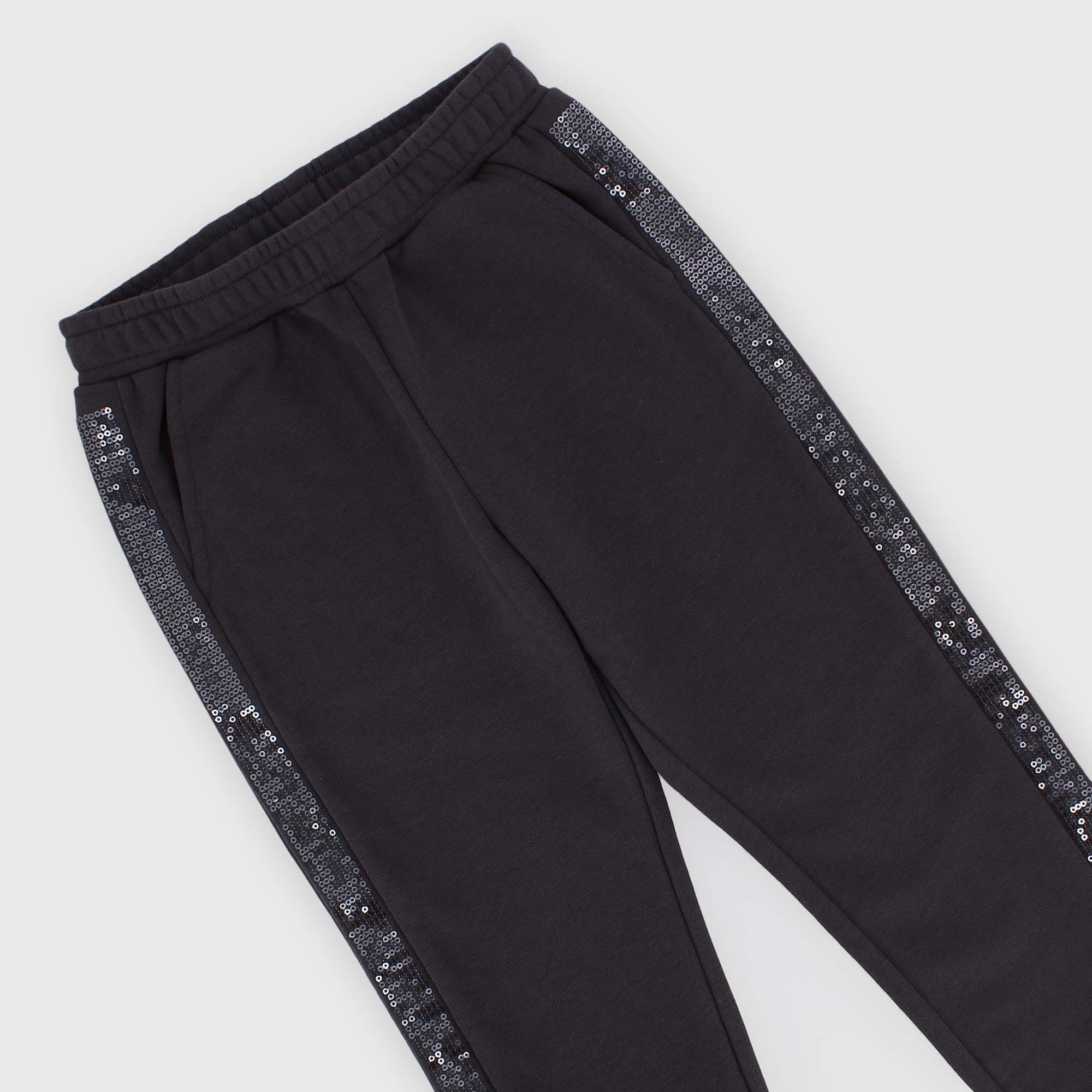 Pantalon de survêtement à taille élastiquée. Poches françaises. Bandes latérales pailletées. Bas élastiqué.