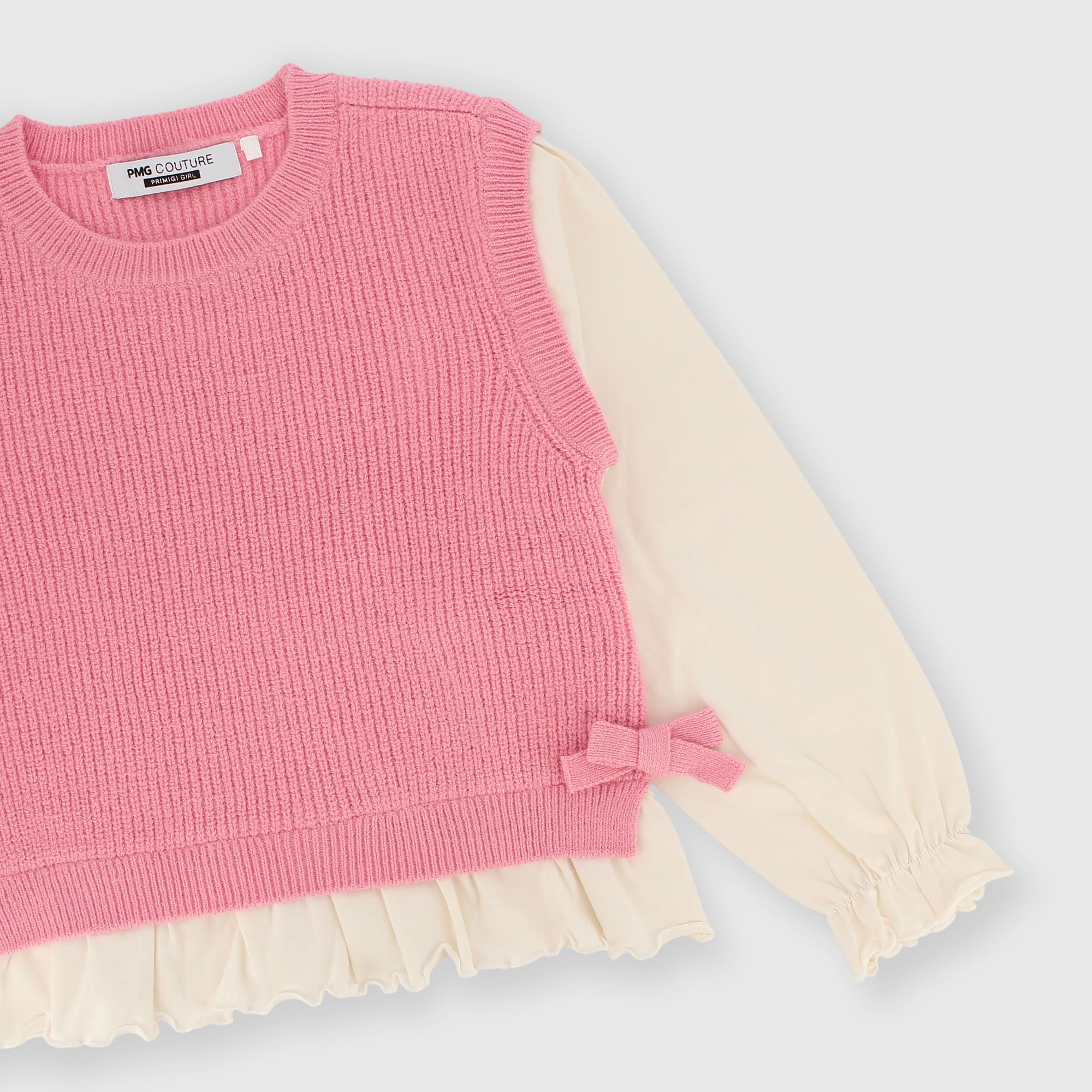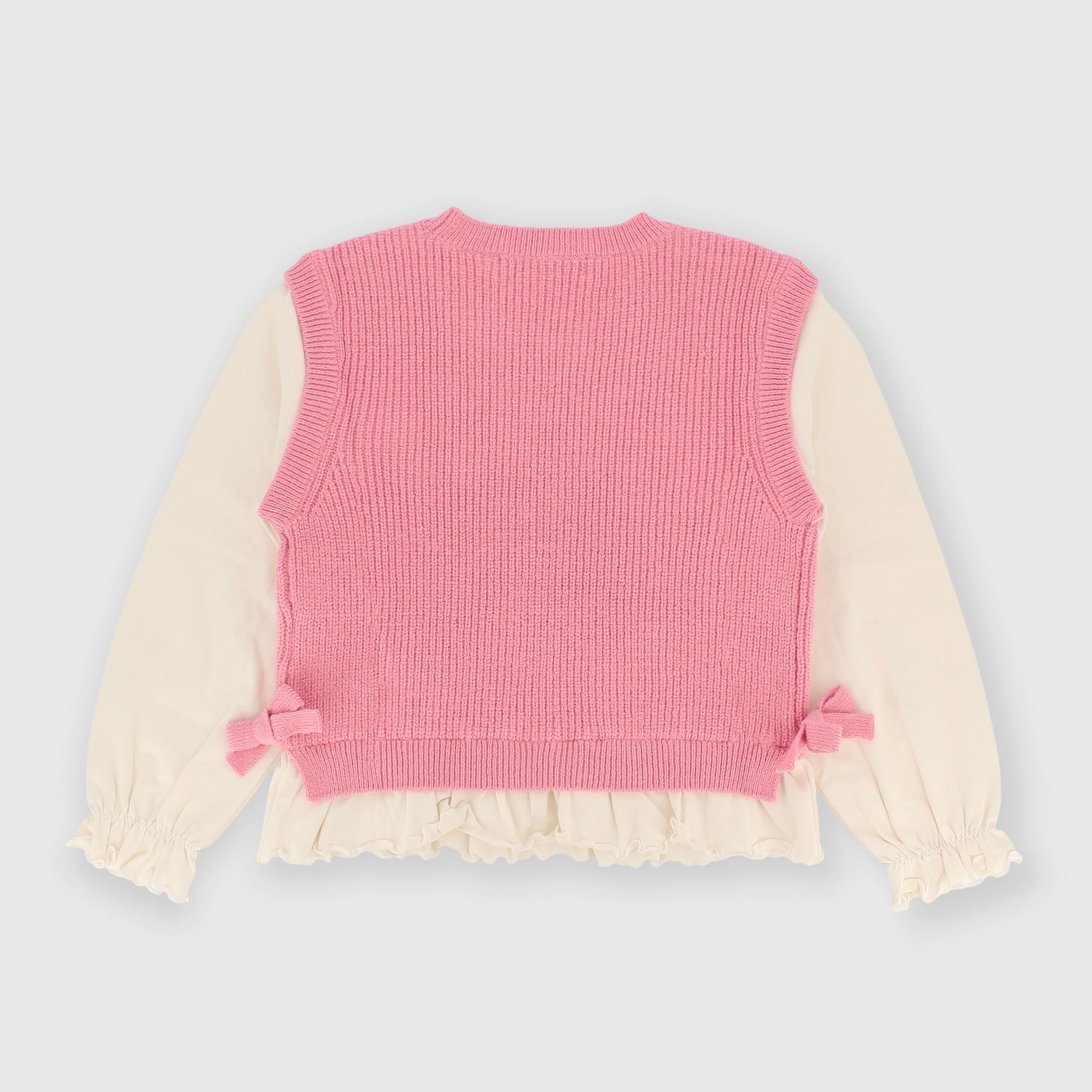 Pull en maille douce, col rond et manches longues. Bas et manches en jersey froncés. Nœuds appliqués sur les côtés.