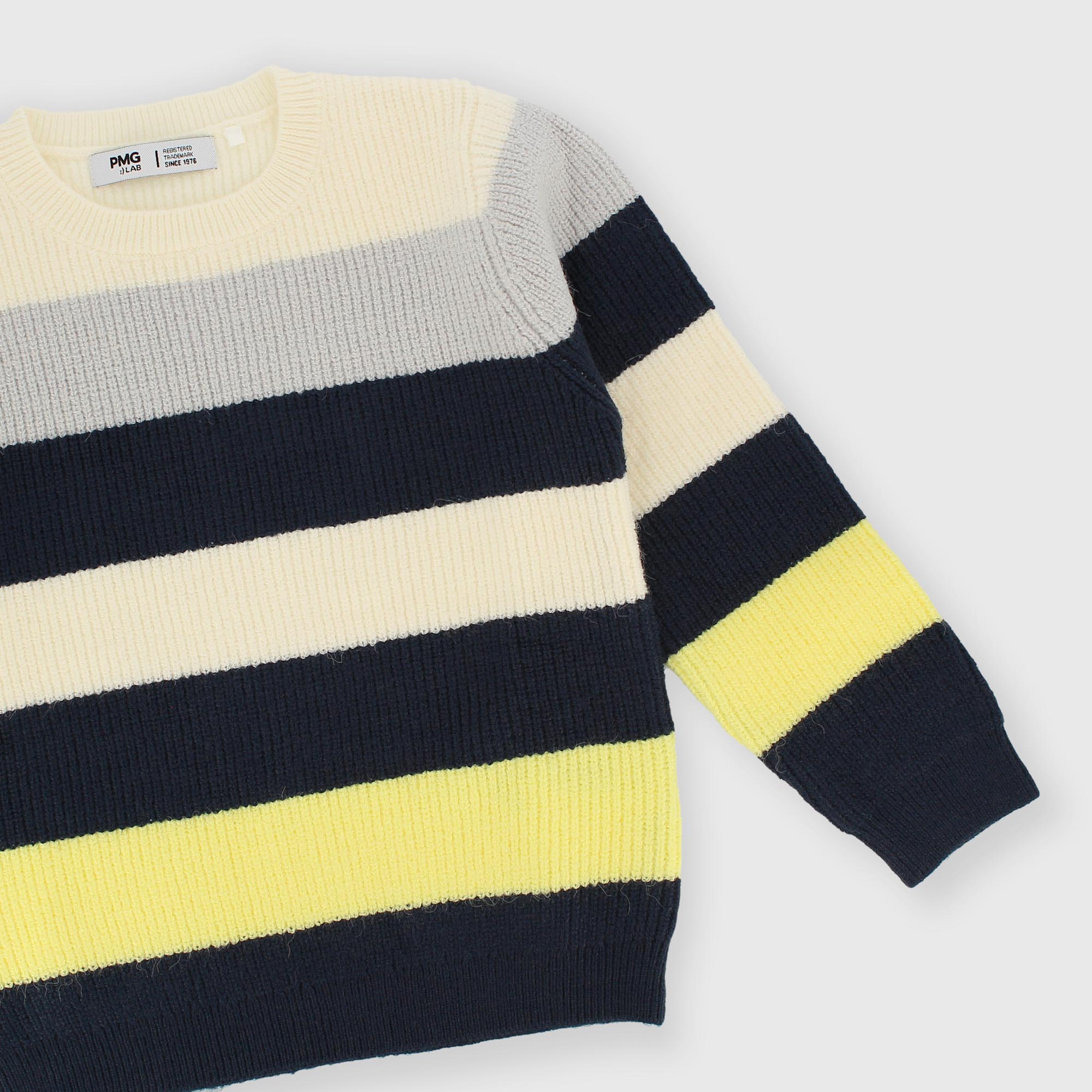 Pull en maille rayée douce, col rond, manches longues.