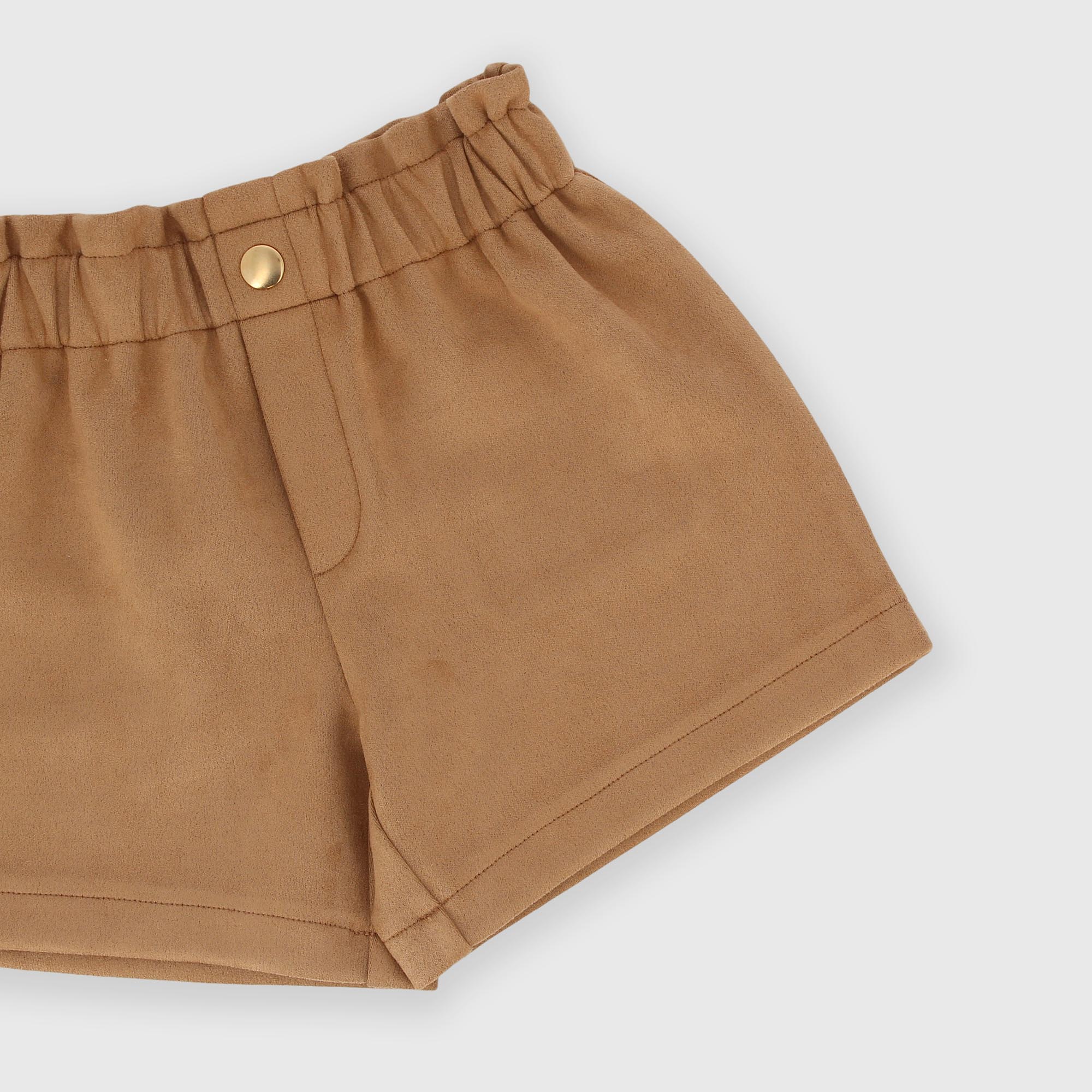 Short en éco-suède avec taille élastiquée. Poches plaquées derrière.