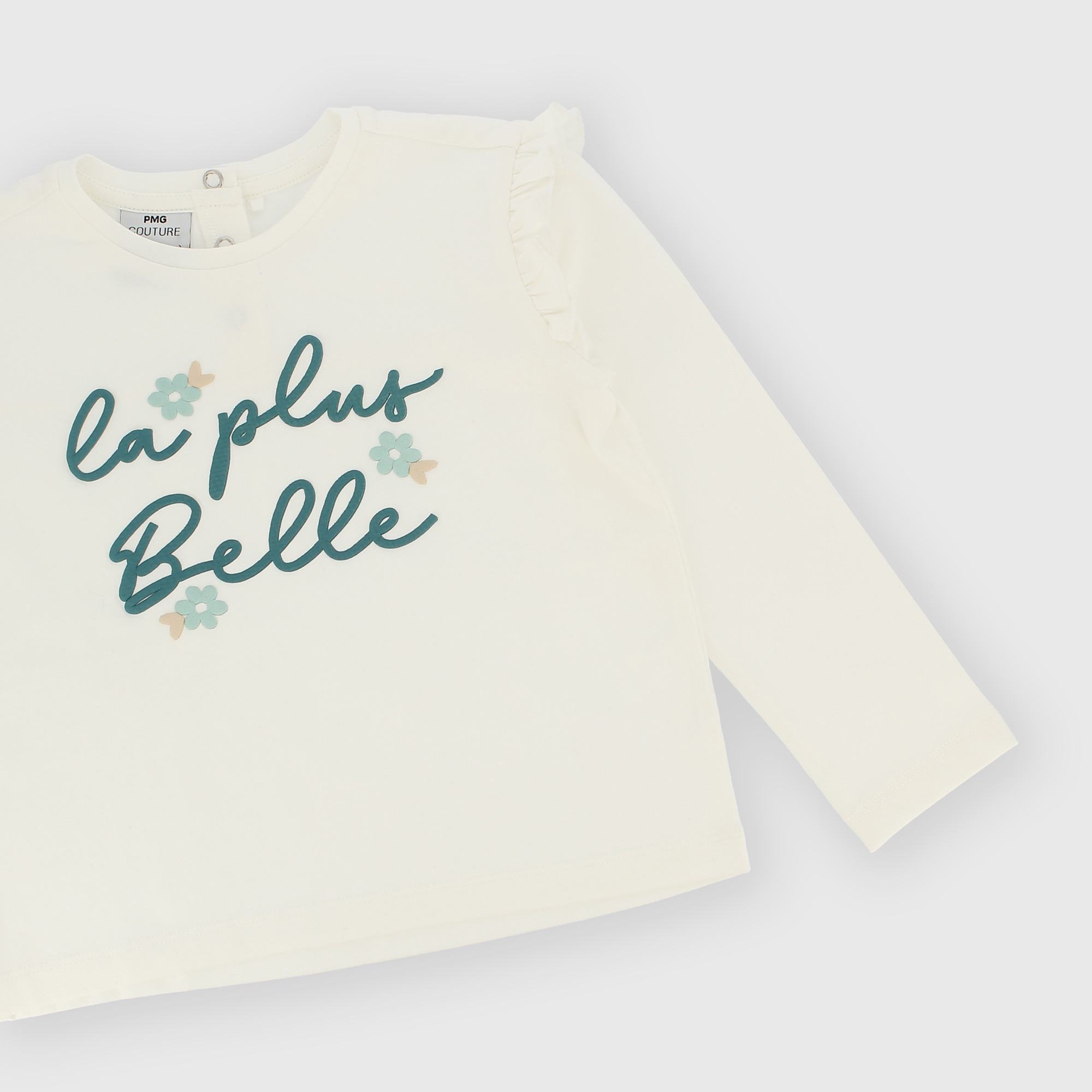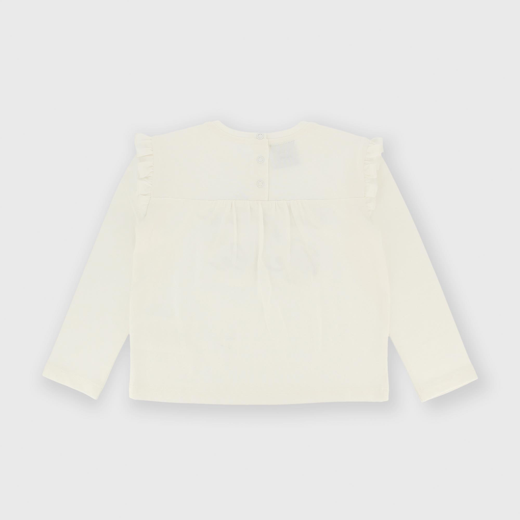 T-shirt en jersey, col rond, manches longues. Fermeture par boutons-pression au dos. Petits volants aux épaules. Application brodée sur le devant.