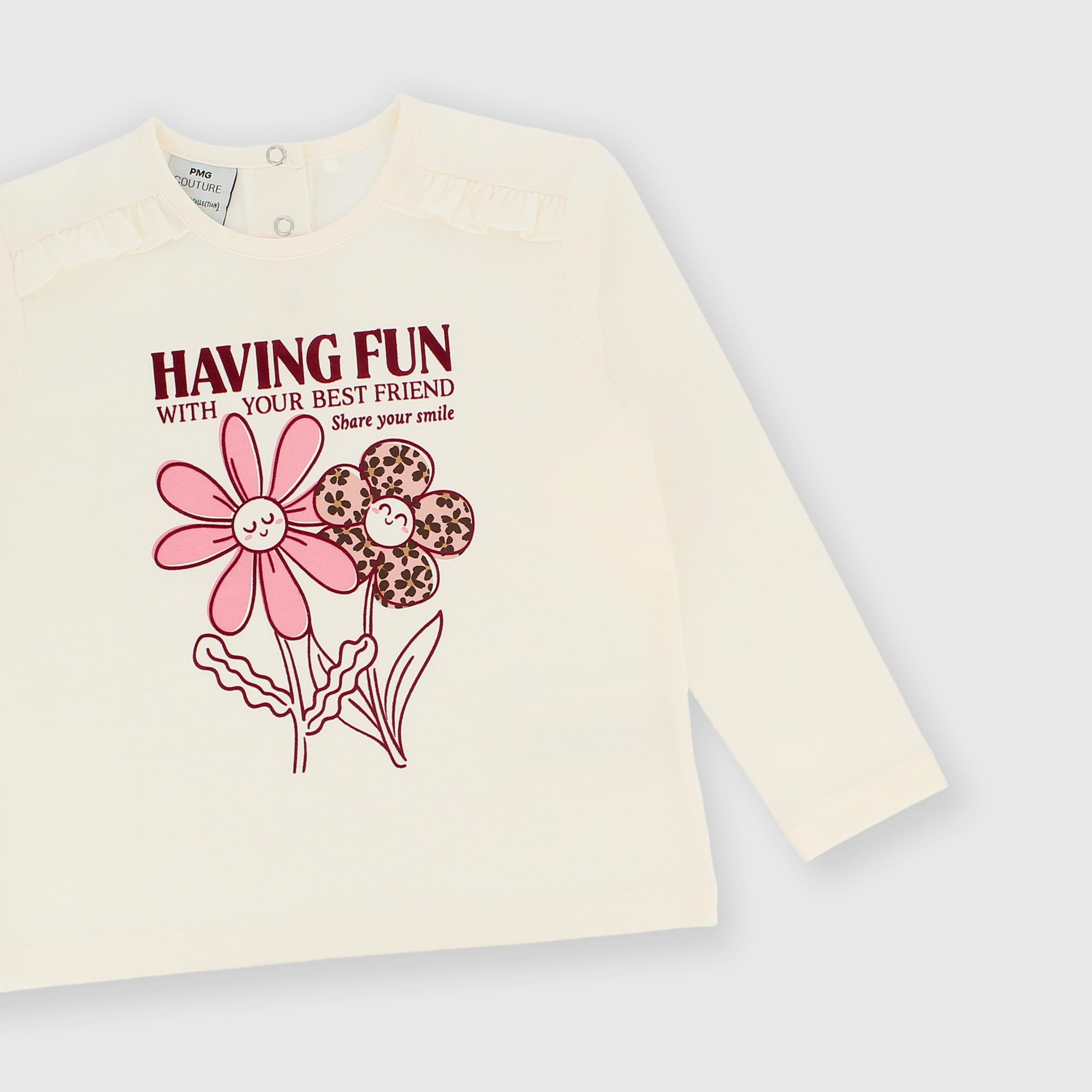 T-shirt en jersey extensible, col rond, manches longues. Fermeture par boutons-pression au dos. Petits volants insérés sur les épaules. Imprimé floqué sur le devant.