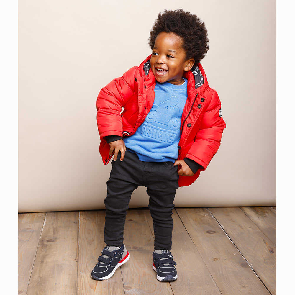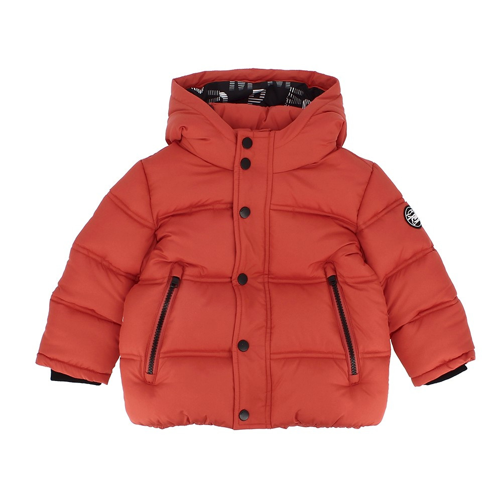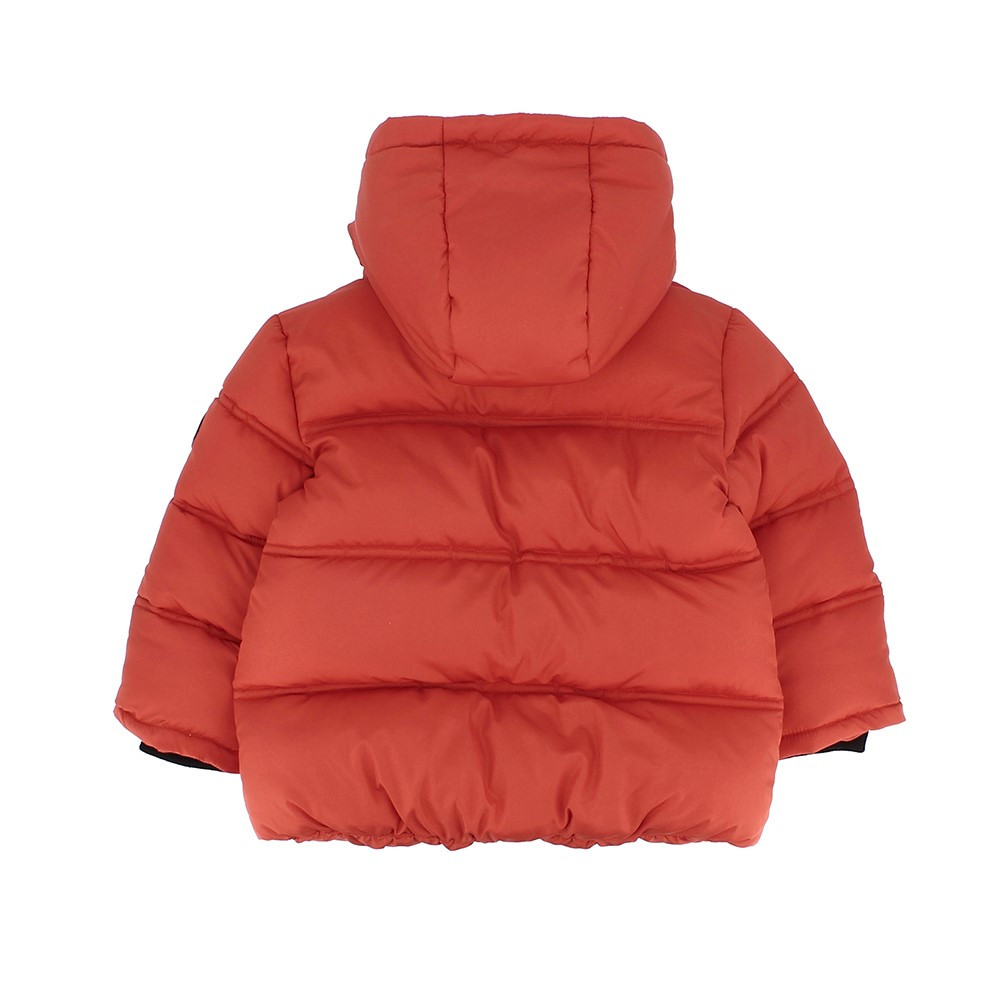 Giubbino in nylon con cappuccio, a maniche lunghe. Chiusura con zip frontale, e bottoni automatici. Tasche anteriori. Fodera interna stampata.