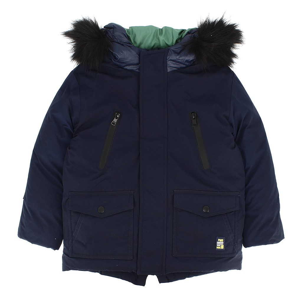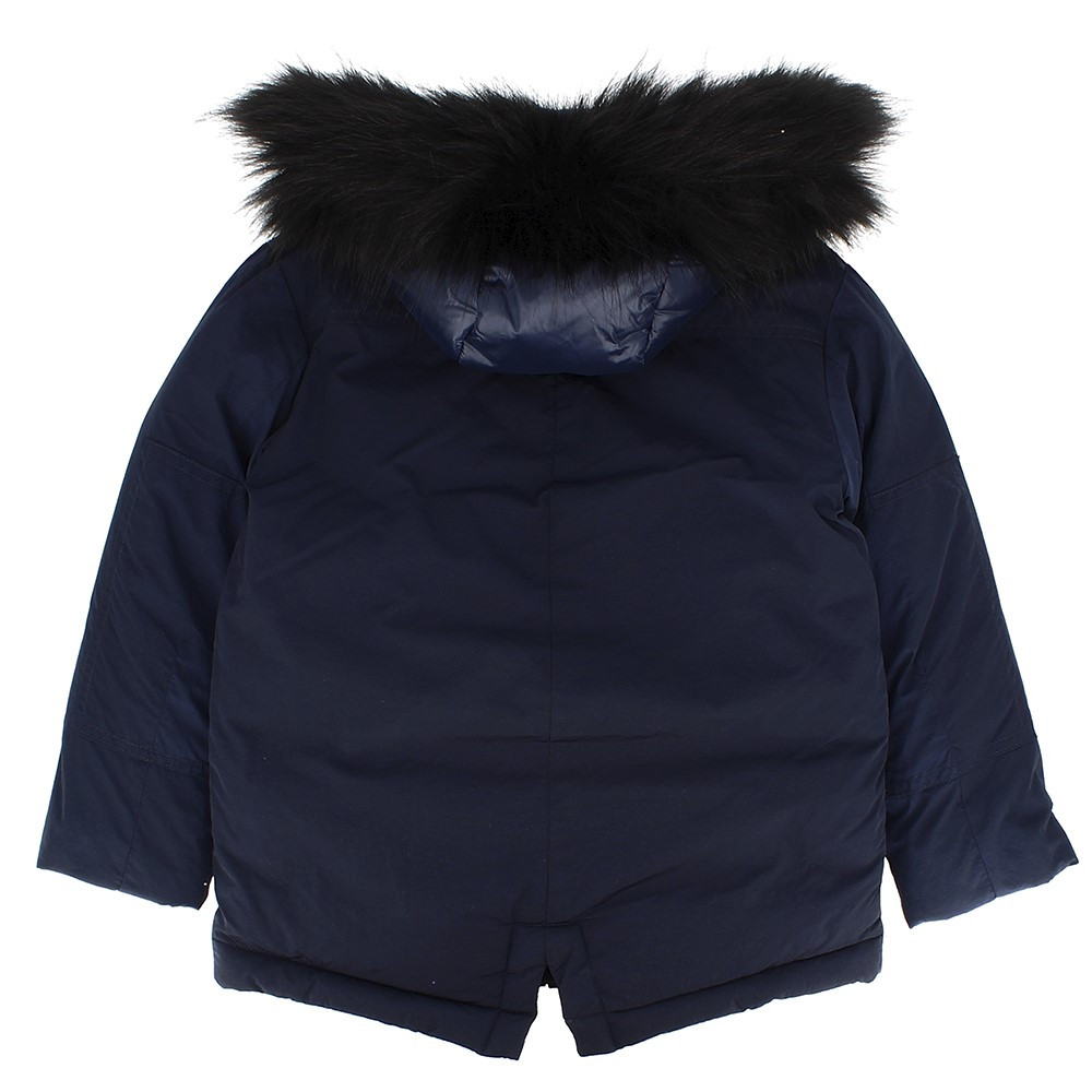 Giubbino in nylon con cappuccio e bordo in ecopelliccia staccabile, a maniche lunghe. Chiusura con zip frontale. Tasche anteriori.