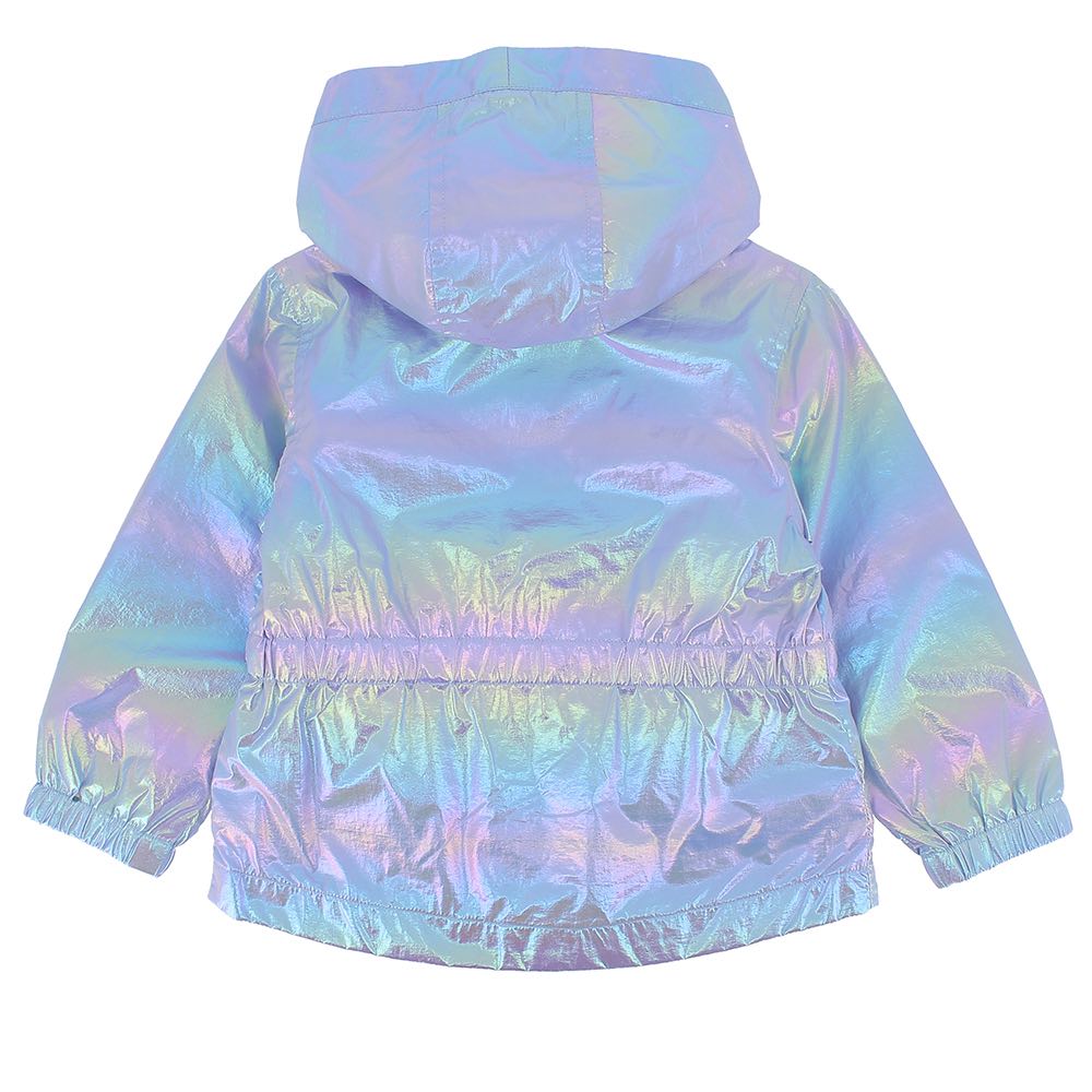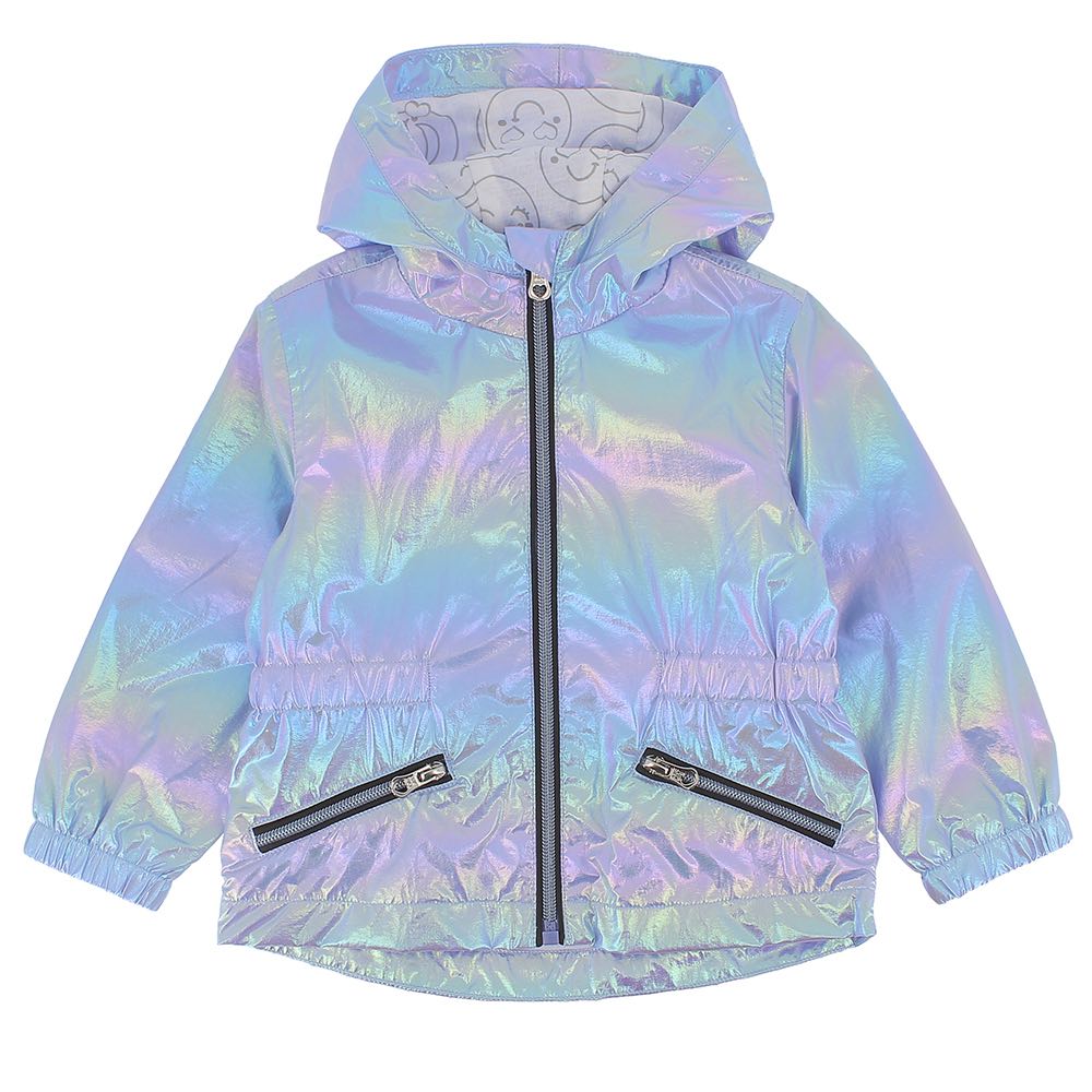 Giubbino in nylon iridescente, con cappuccio, a maniche lunghe. Chiusura frontale con zip con profili a contrasto. Tasche anteriori con zip, elastico su vita e fondo manica. Fodera interna in jersey.