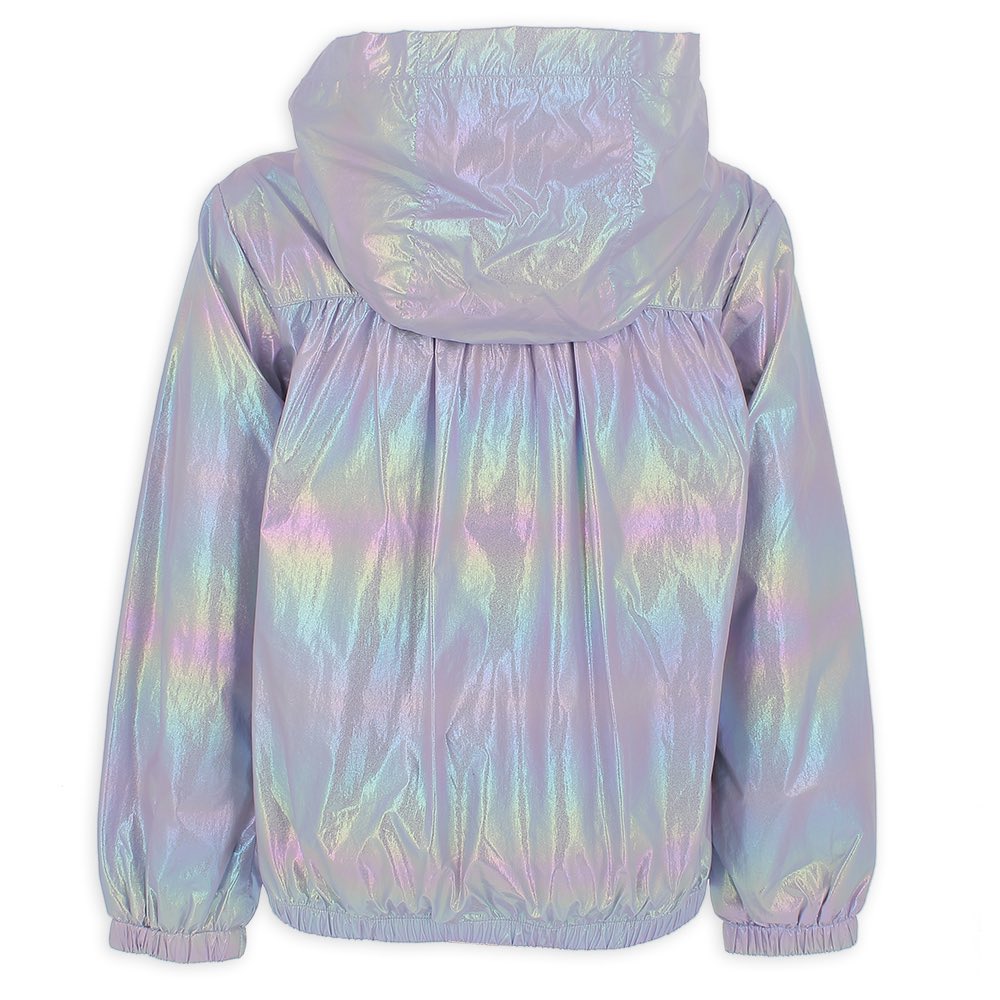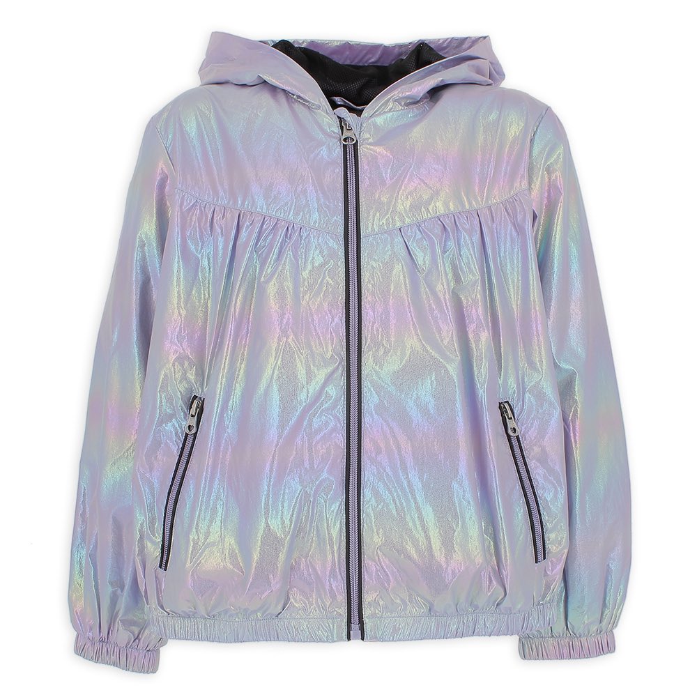 Giubbino in nylon iridescente, con cappuccio, a maniche lunghe. Chiusura frontale con zip con profili a contrasto. Tasche anteriori con zip, fondo con elastico, fodera interna in micro-rete.