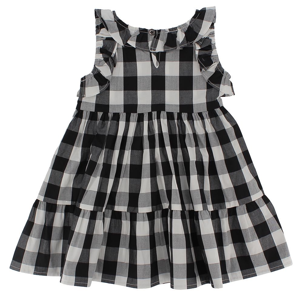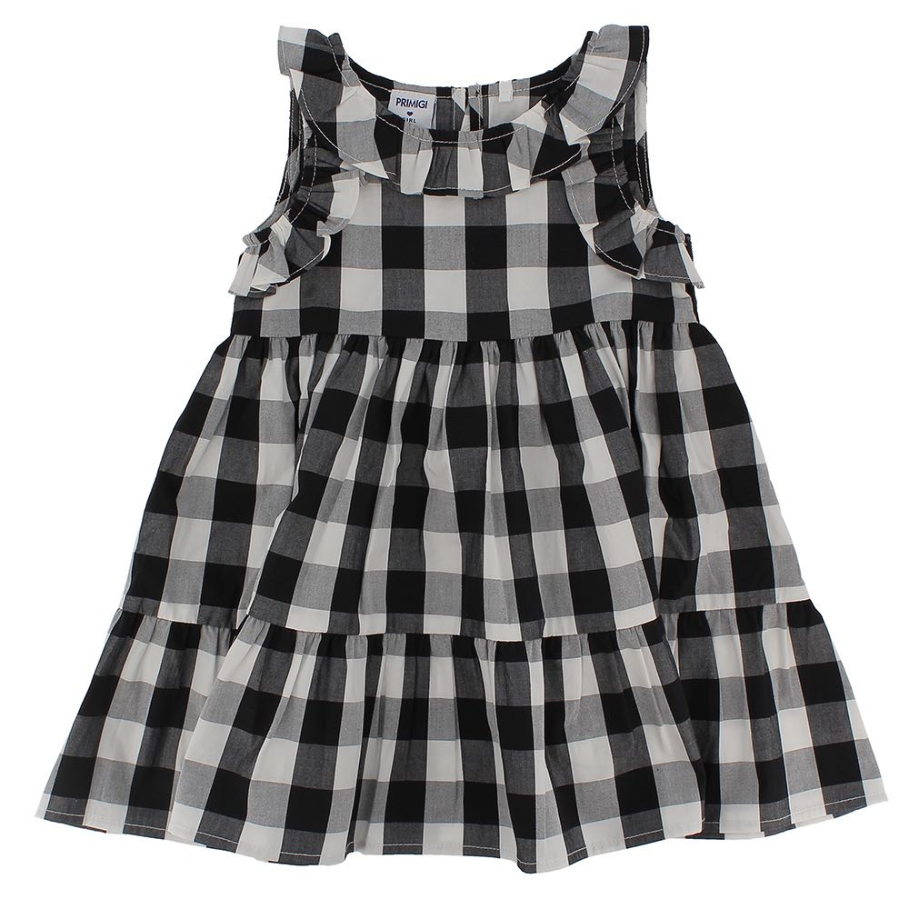 Abito in popeline di cotone, girocollo senza maniche. Chiusura a goccia con bottone posteriore. Volants su colletto e gonna