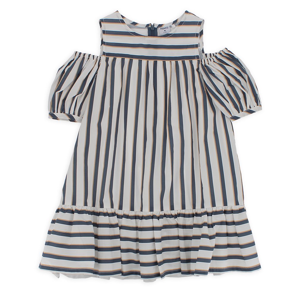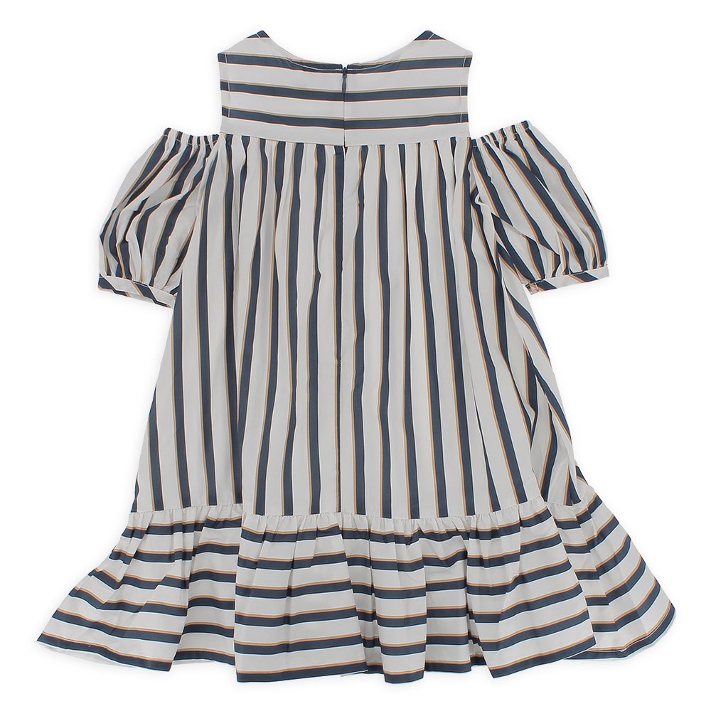 Abito in popeline di cotone, girocollo, con maniche staccate baloon. Chiusura con zip posteriore. Volants sulla gonna.