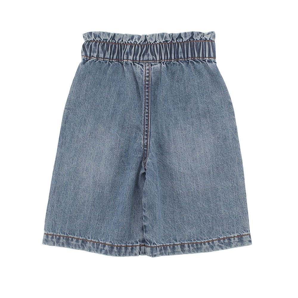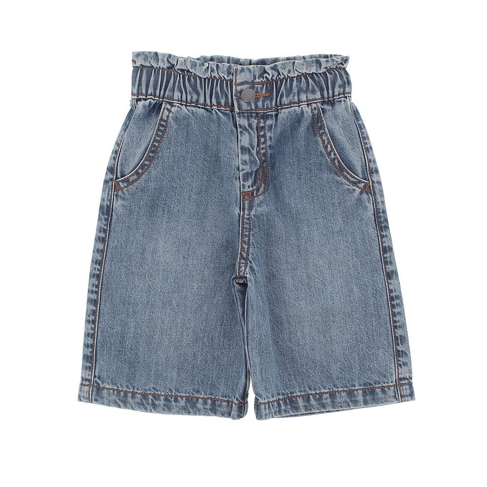 Pantalone culotte in denim leggero, con vita elasticizzata. Chiusura con bottone e automatici. Tasche laterali.