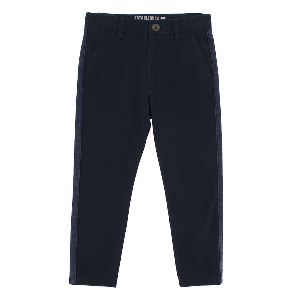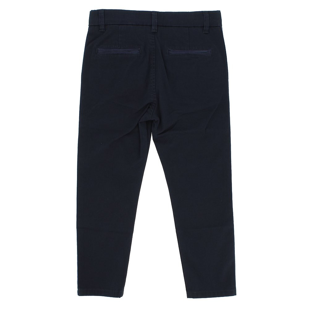 Pantalone in gabardina elasticizzata, con vita regolabile all'interno. Chiusura con zip e bottone. Tasche laterali alla francese e tasche posteriori a listino. Banda laterale applicata in cotone ton sur ton.