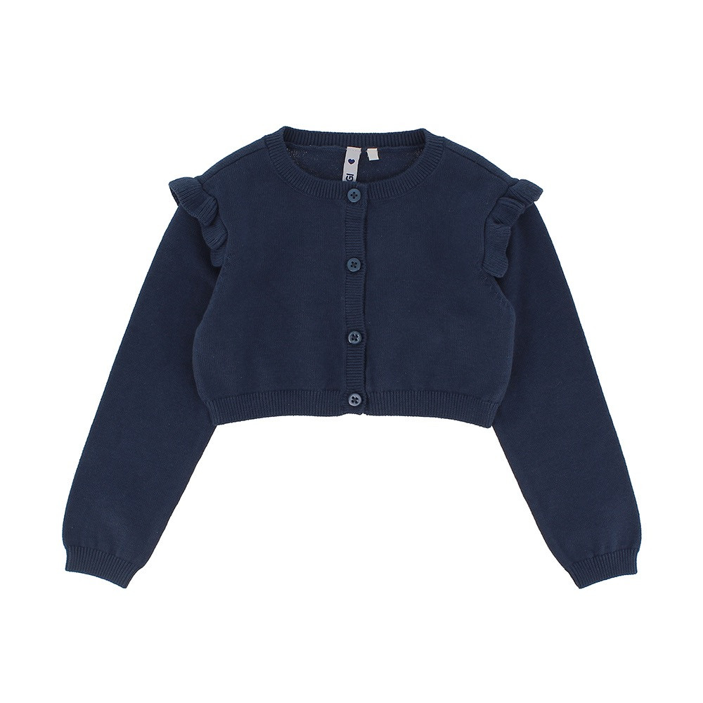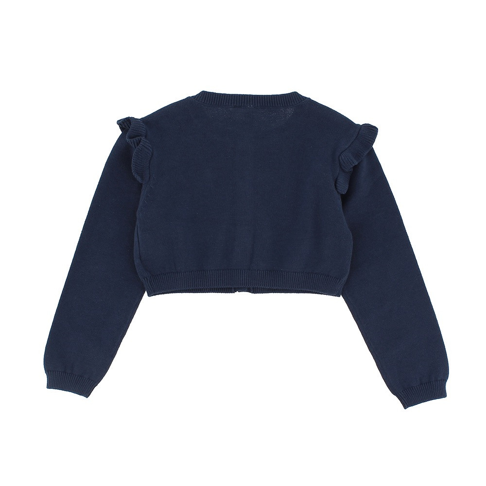 Cardigan in maglia, con scollo rotondo, a maniche lunghe con volants. Chiusura frontale con bottoni.