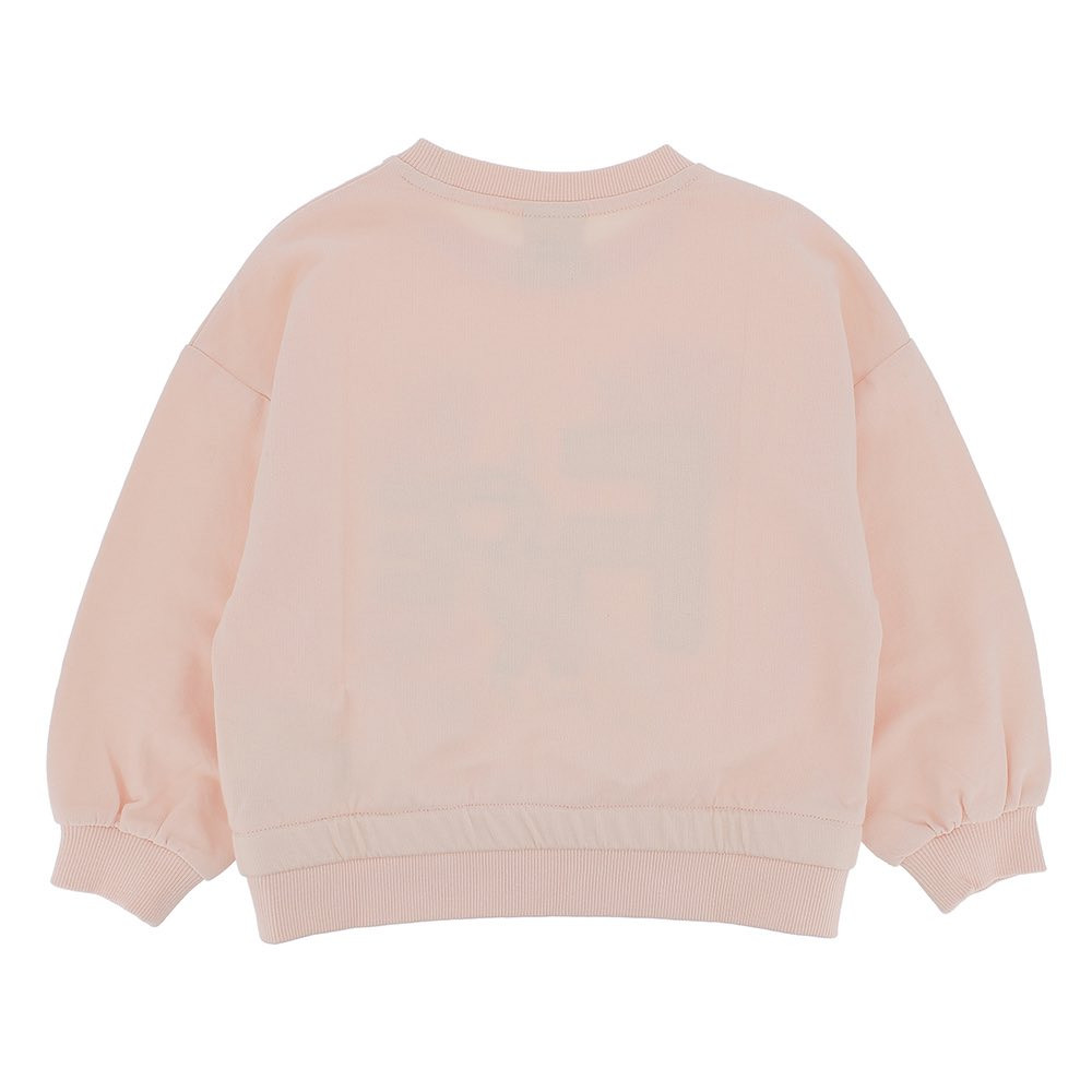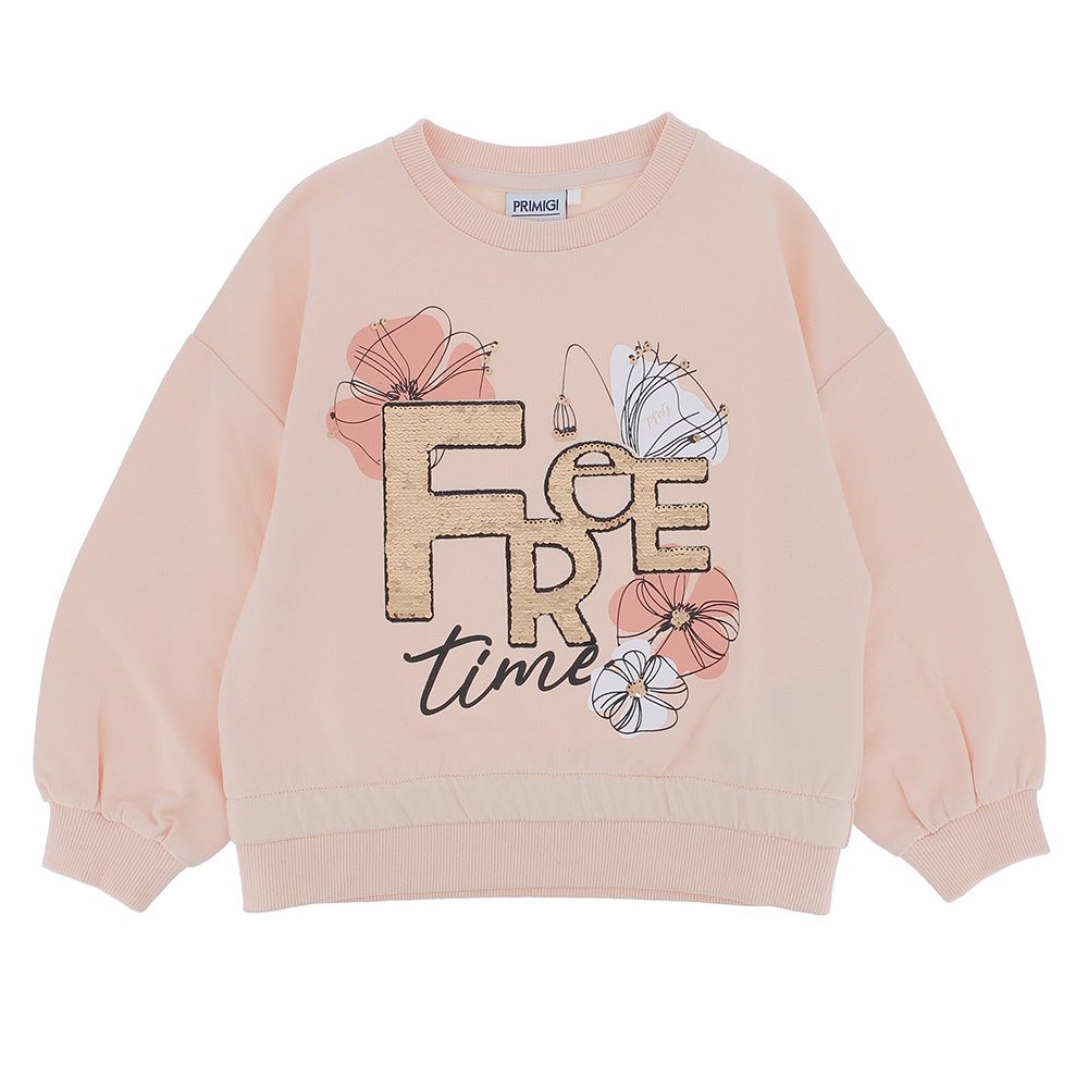 Felpa boxy girocollo, con maniche lunghe baloon. Stampa frontale con ricami e applicazioni in paillettes. Fondo con elastico.