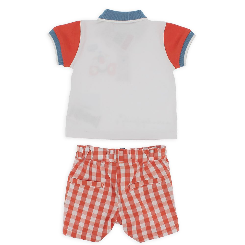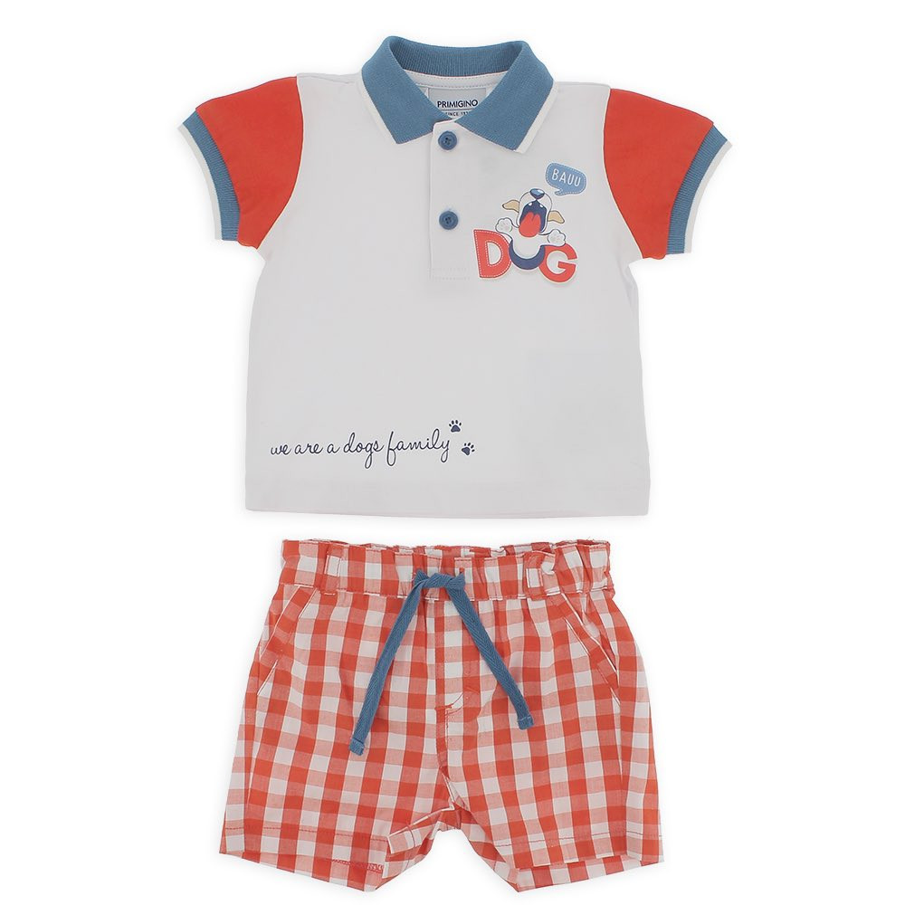 Completo composto da due pezzi. Polo in jersey a maniche corte. Chiusura frontale con bottoni. Stampa frontale con cagnolino e scritte. Pantaloncino in cotone a fantasia Vichy con vita elasticizzata regolabile internamente e coulisse.