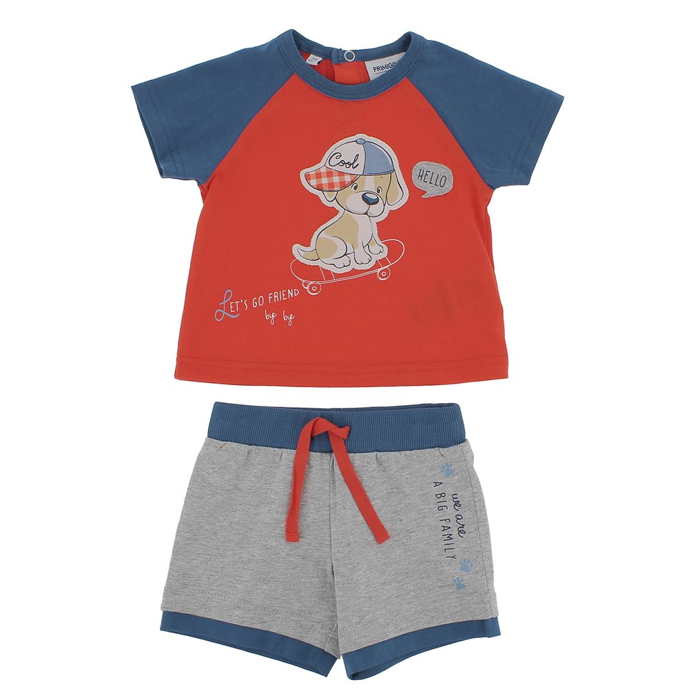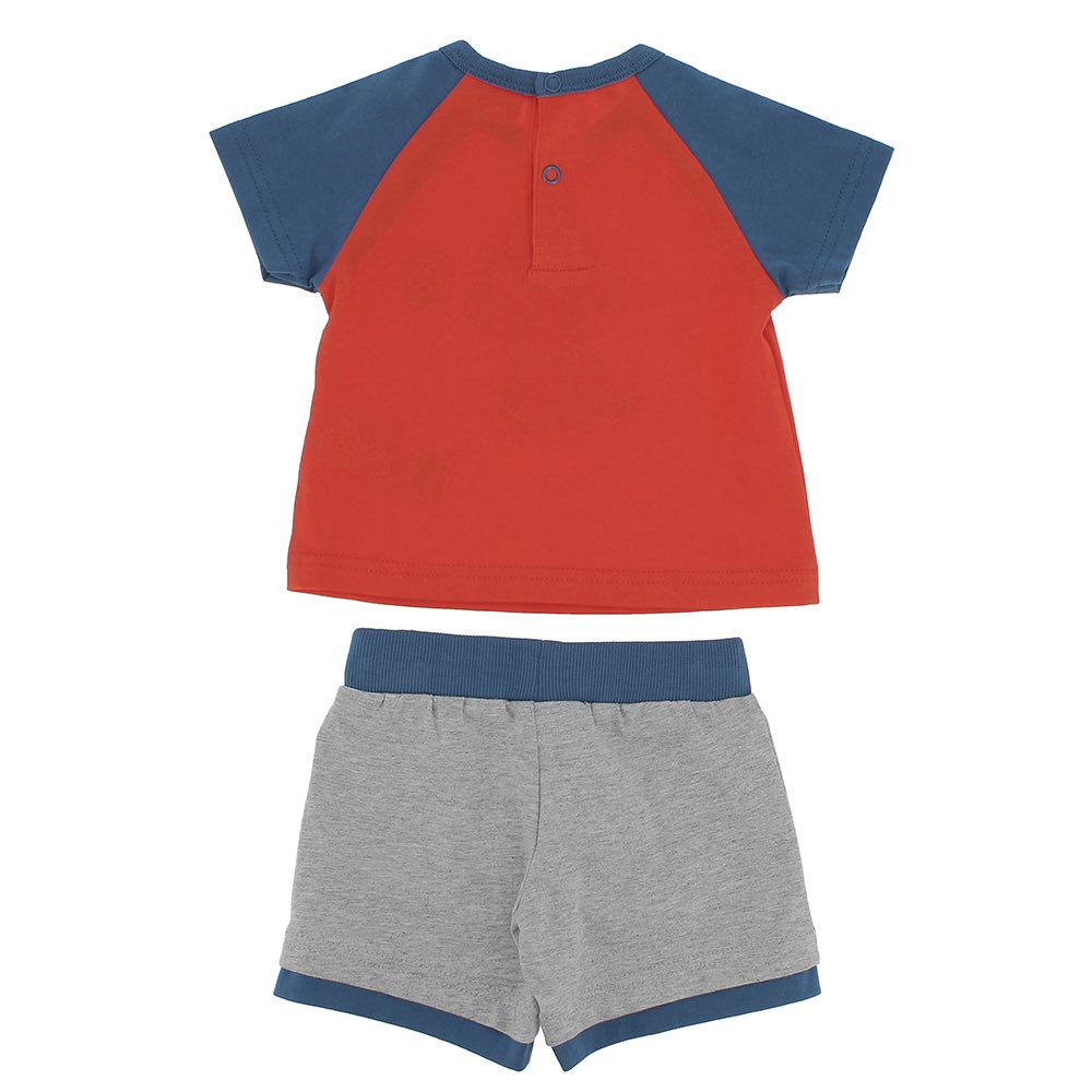 Completo composto da due pezzi. T-shirt in jersey girocollo, a maniche corte. Chiusura posteriore con bottoni automatici. Stampa frontale con cagnolino ricamato. Pantaloncino in jersey con vita elasticizzata e coulisse. Stampa laterale e dettagli a contrasto.